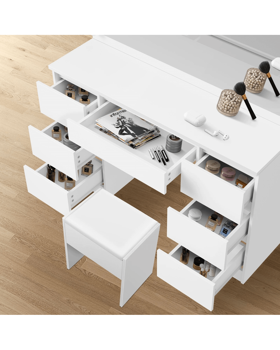 Keep your items organized - It features 7 drawers in different sizes for various storage options. For items you want to access easily, like make-up products, lotions, or perfumes, you can simply put them on desktop of table. For other items, like jewellery, you can store them away in drawers so they won't gather dust.