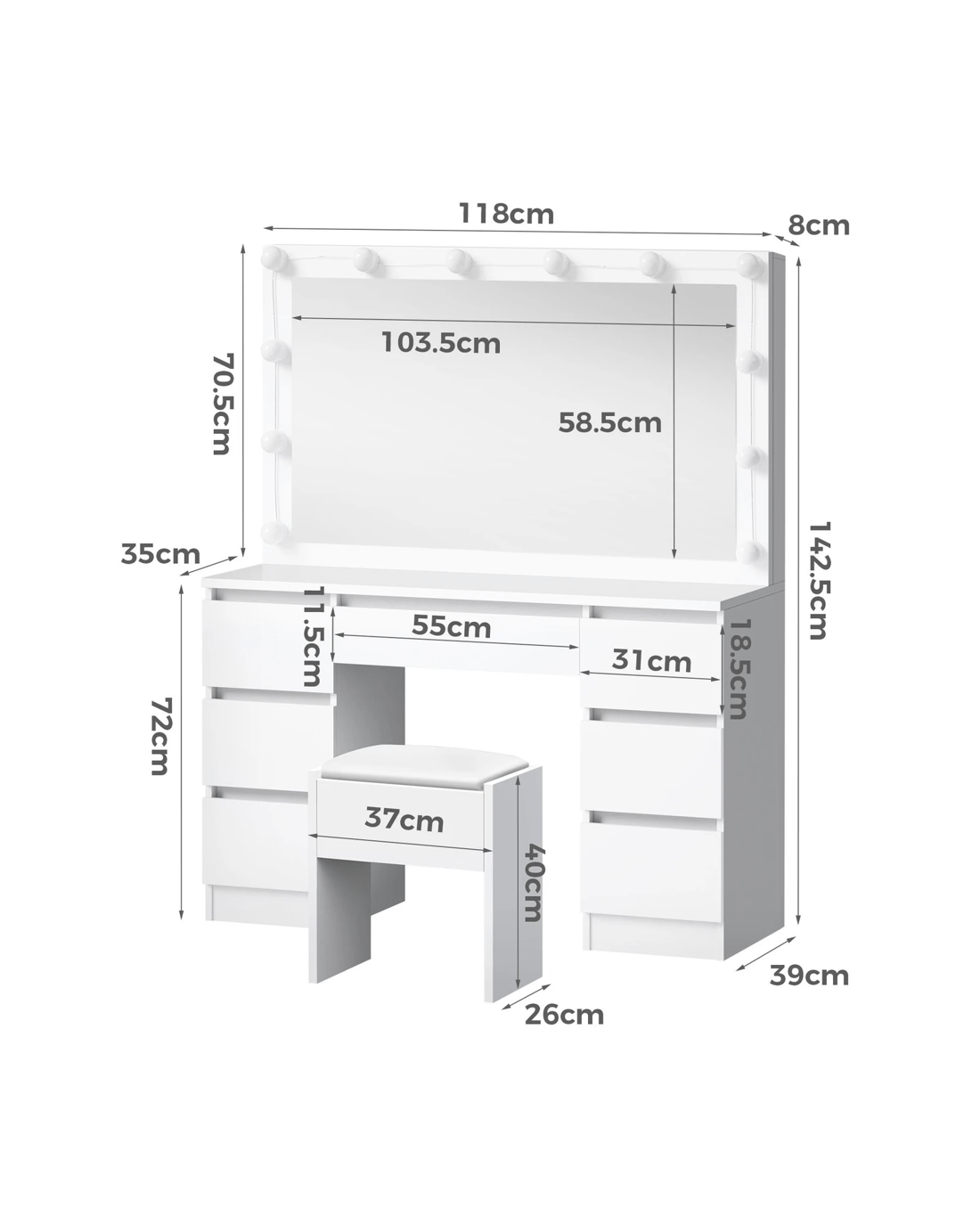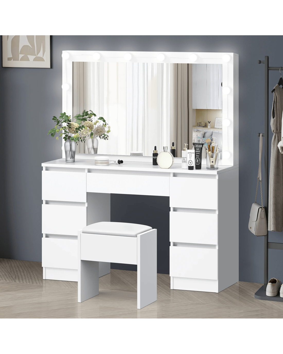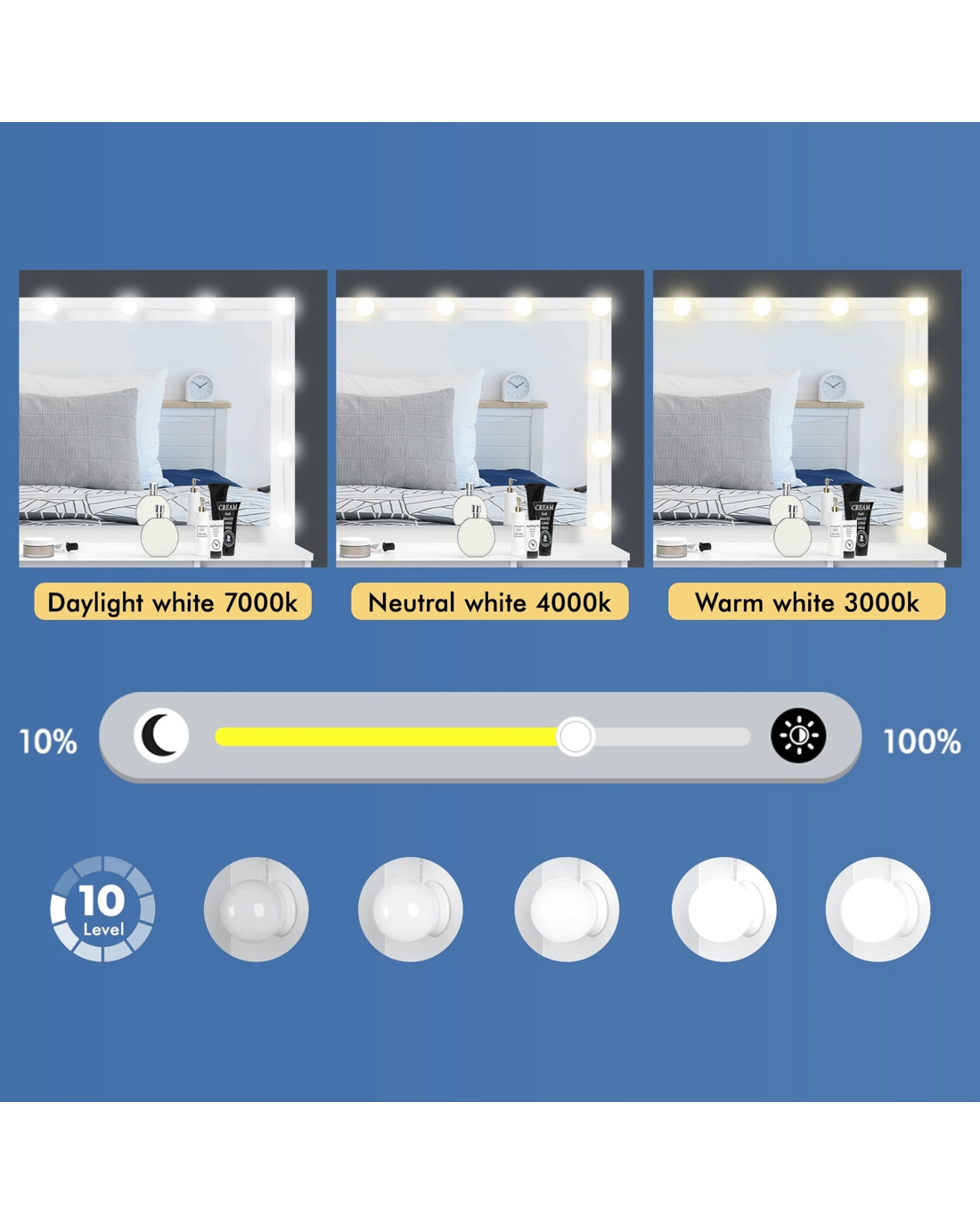 Customizable lighting - Good lighting is important to achieve your perfect glam look. The dressing table features 3 LED light colours - neutral white, warm white, and daylight white and the brightness of each colour can be adjusted in 10 levels, providing adequate light to complete your make-up.
