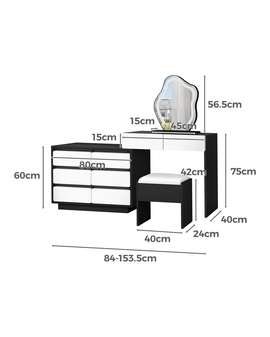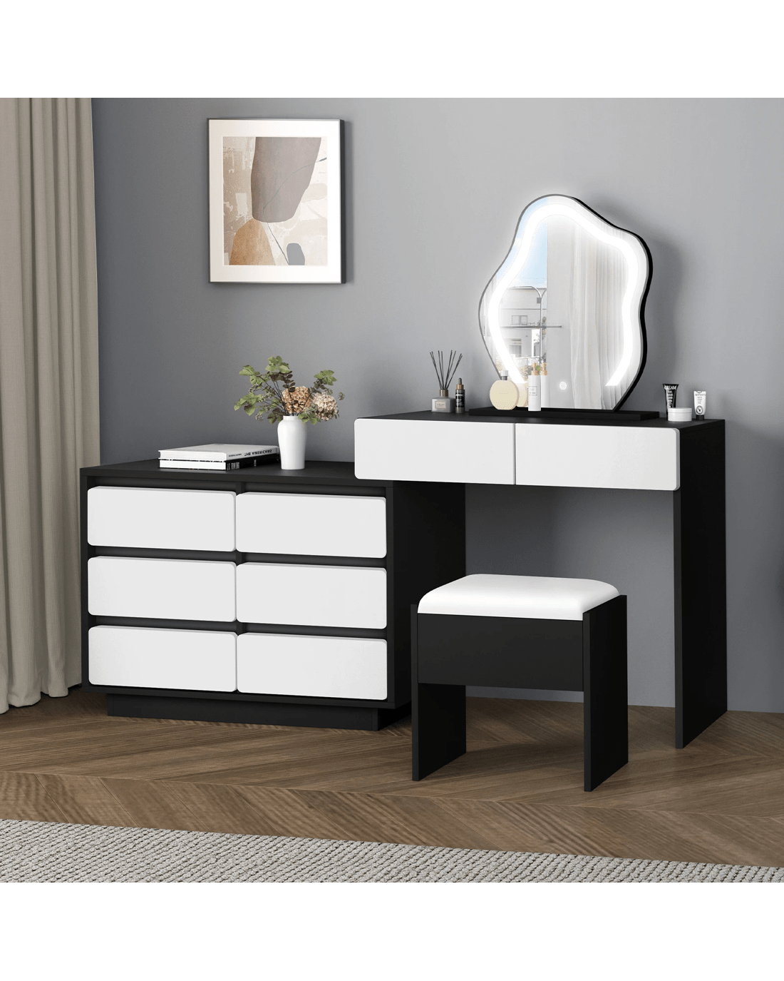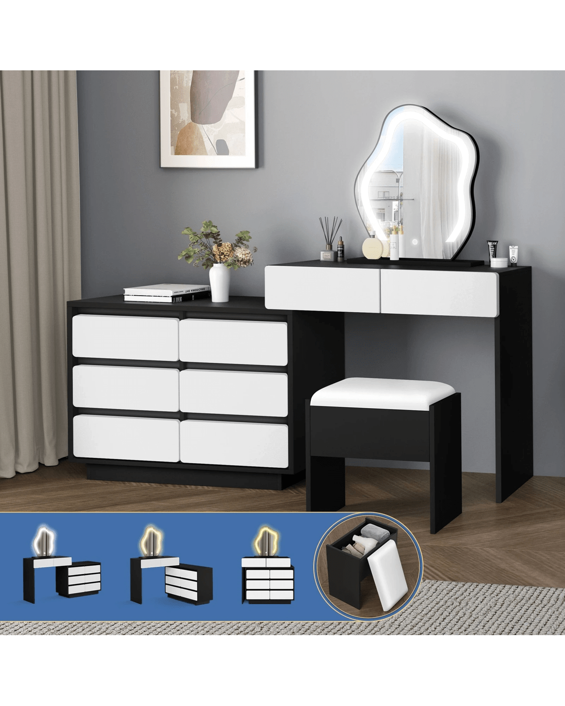 Sold by Aussie Union GroupAlfordson Dressing Table Stool Set Makeup Mirror Desk LED 8 Drawers - Black White