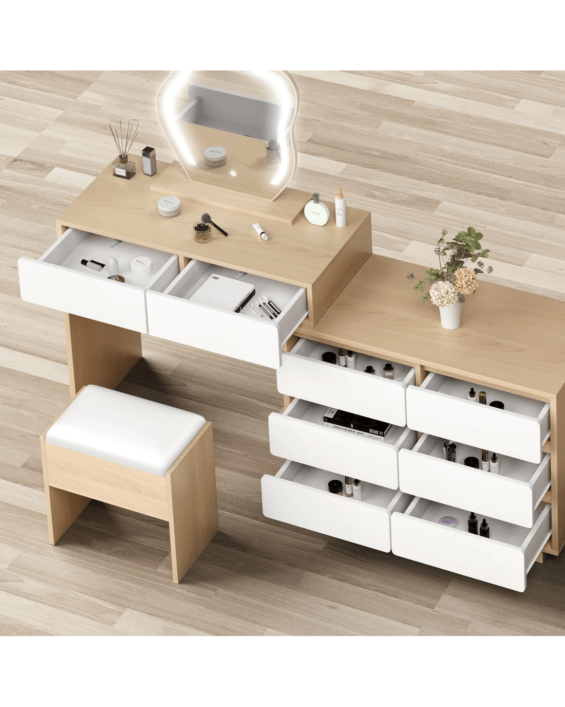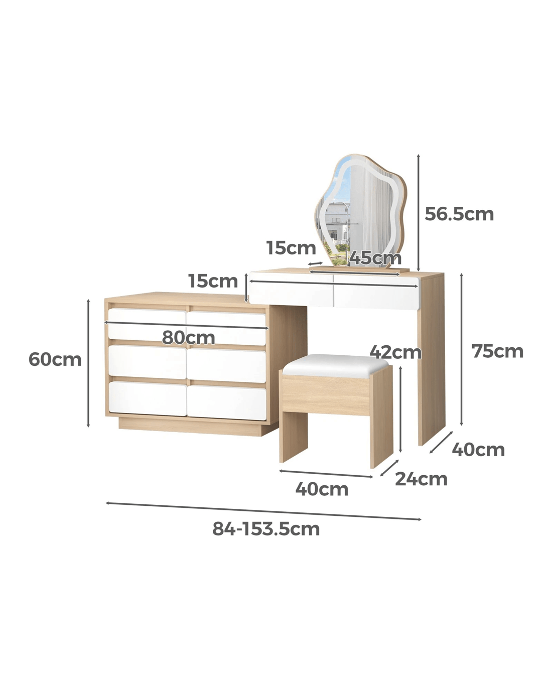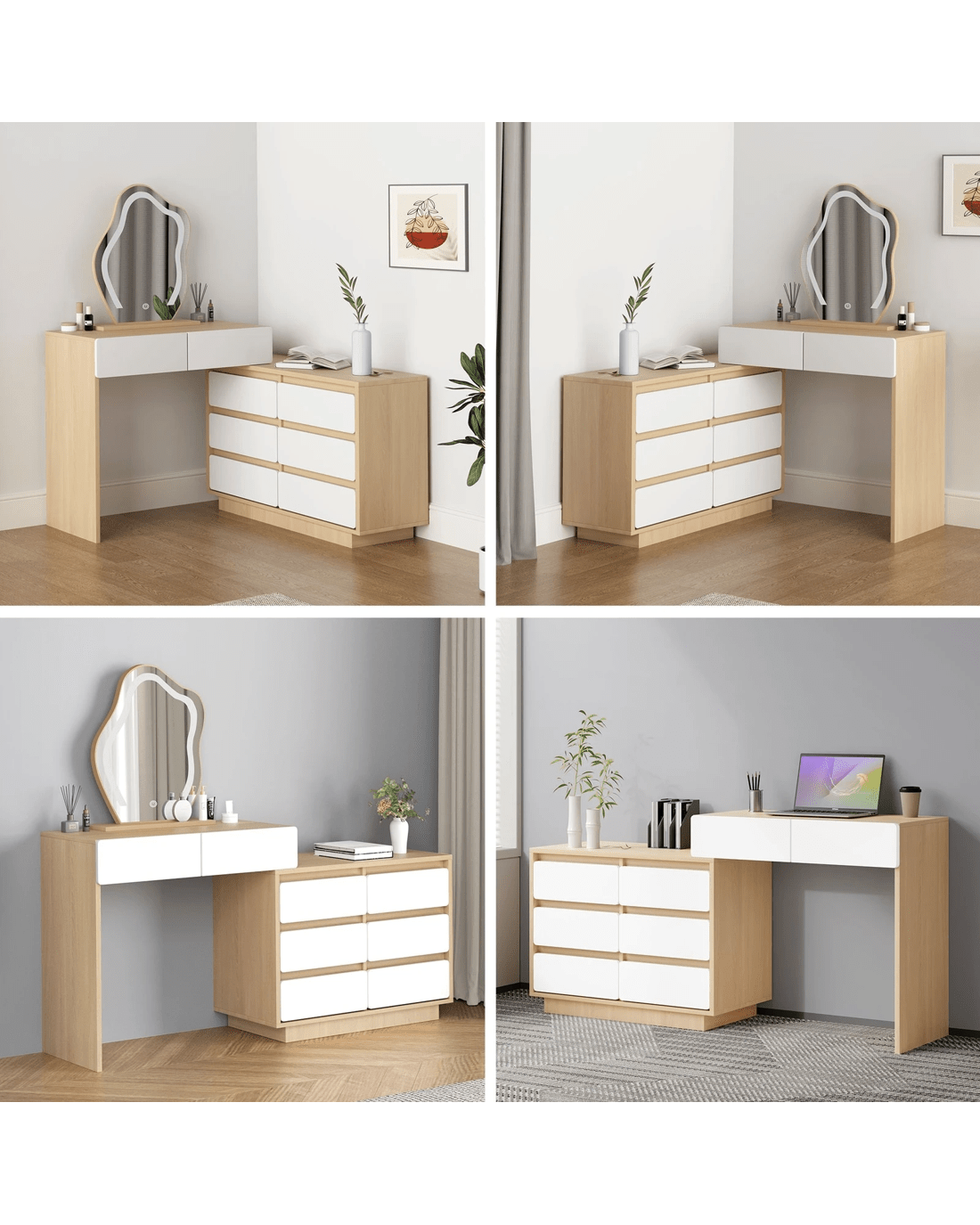 Adjustable side cabinet - With compact and flexible design, the dressing table features a movable 6-drawer chest which can be installed on the left or right side to meet your multiple placement needs. More importantly, it can be adjusted from 84cm to 153.5cm in width or placed in 90 degrees to fit in corner, making it possible to fully utilize room space.