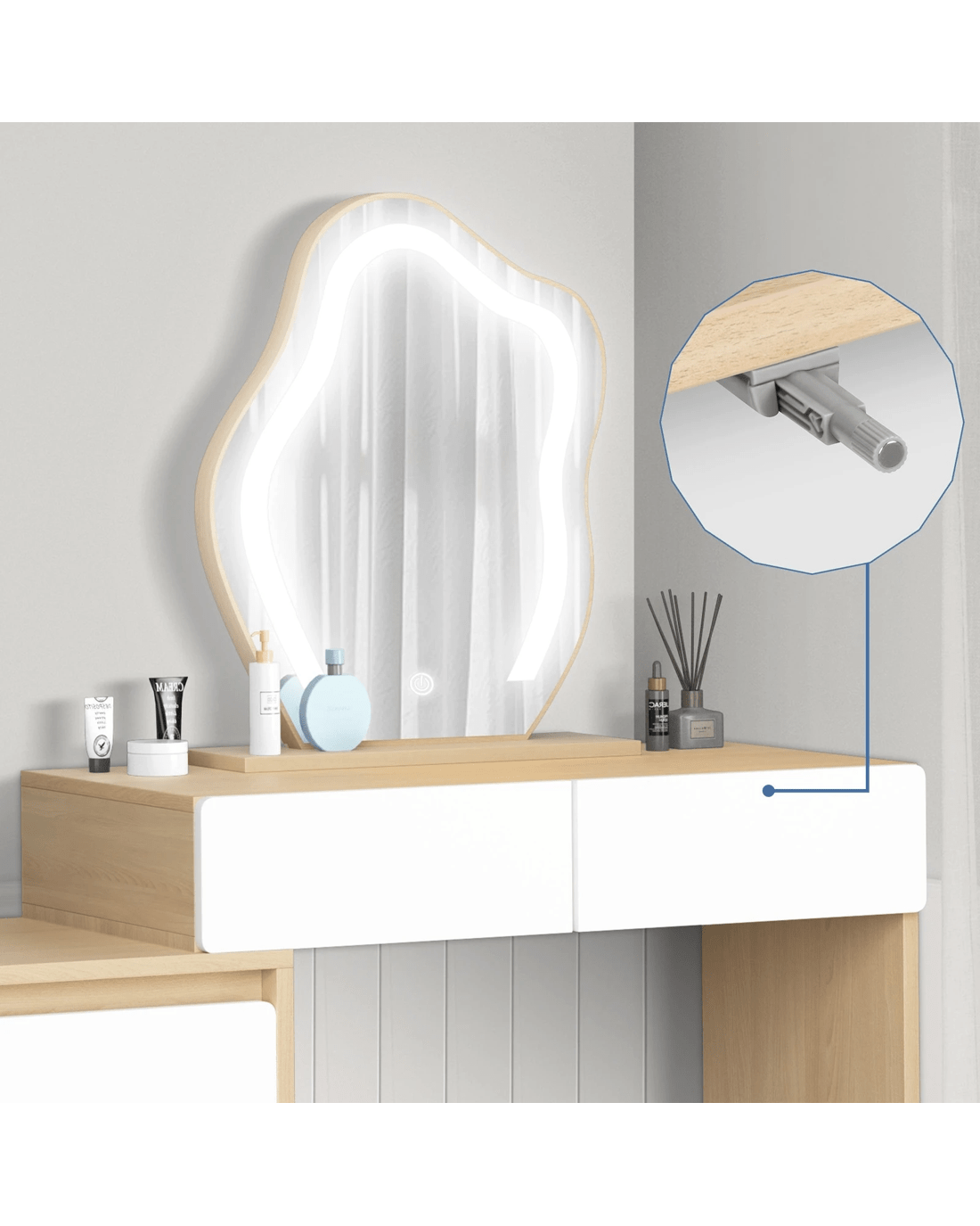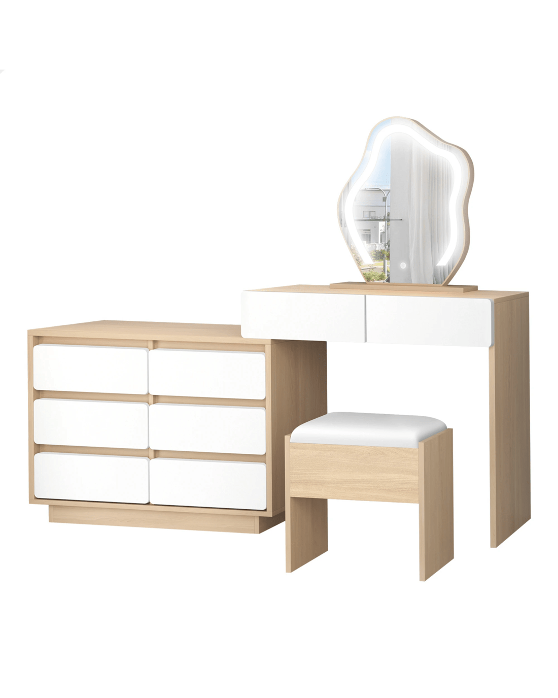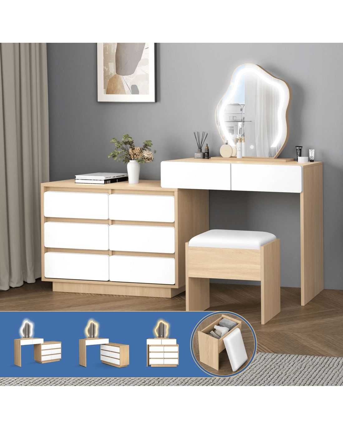 Adjustable side cabinet - With compact and flexible design, the dressing table features a movable 6-drawer chest which can be installed on the left or right side to meet your multiple placement needs. More importantly, it can be adjusted from 84cm to 153.5cm in width or placed in 90 degrees to fit in corner, making it possible to fully utilize room space.