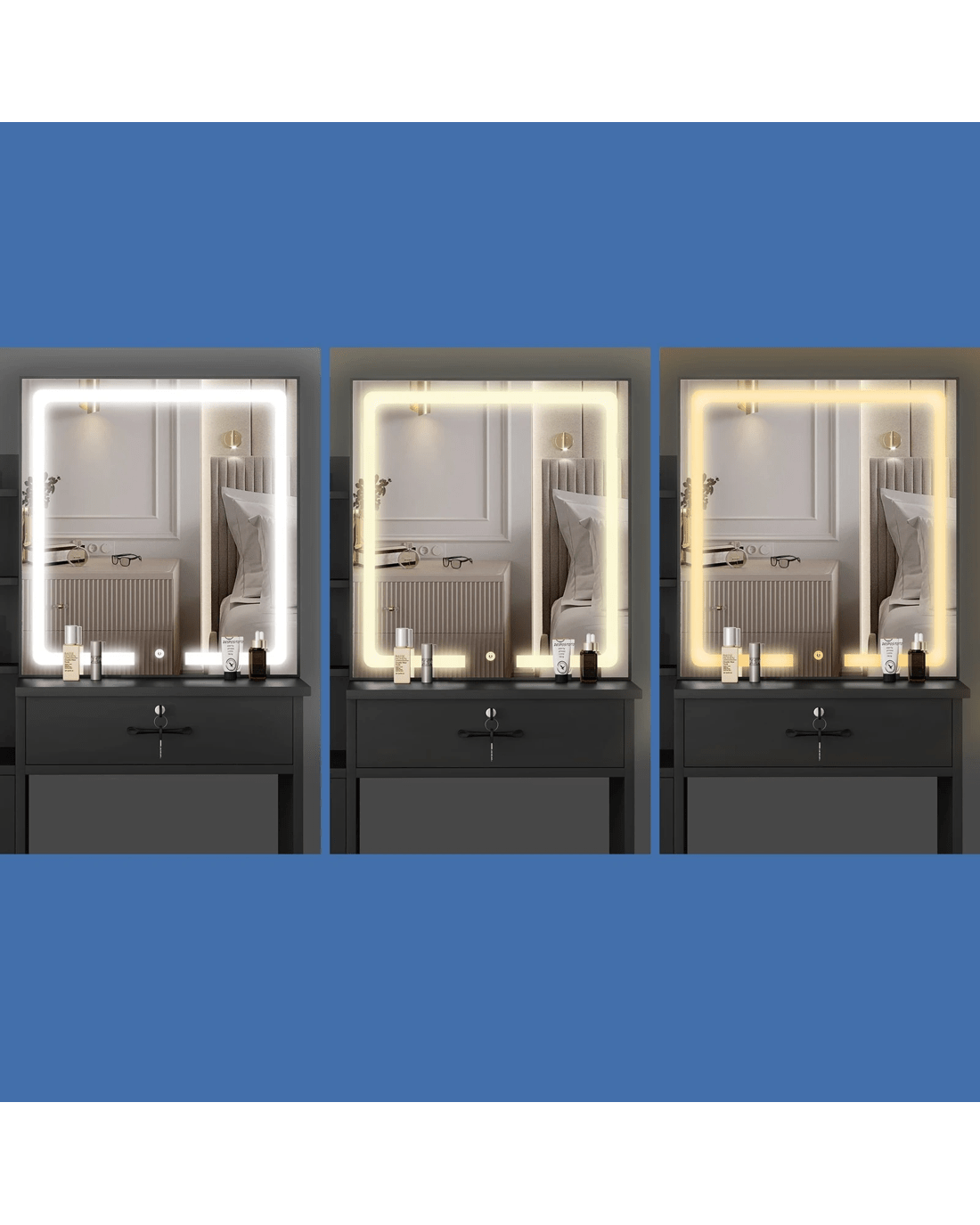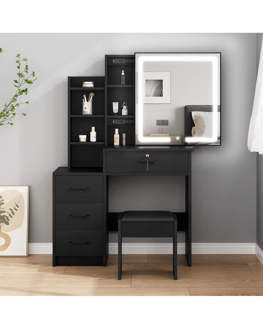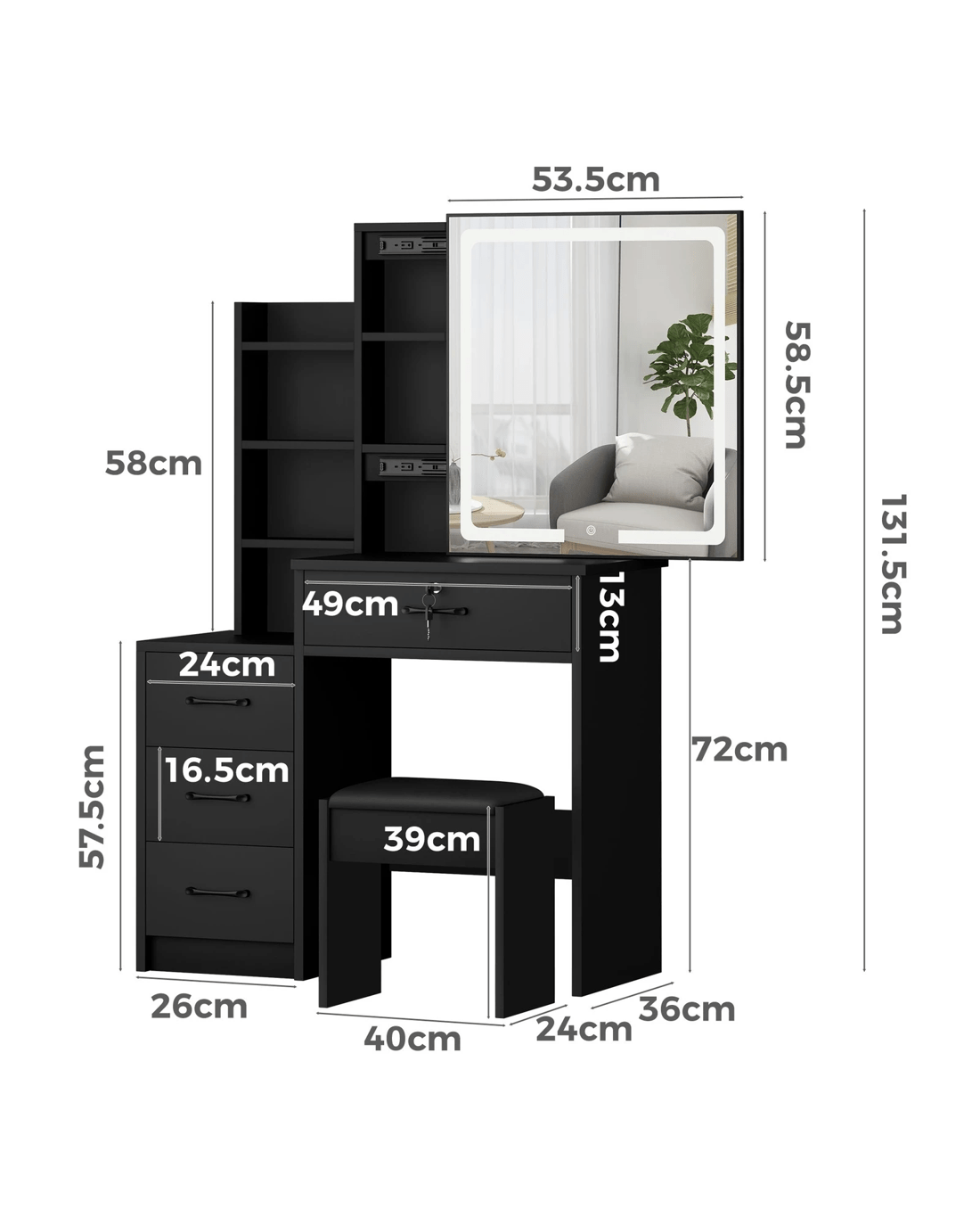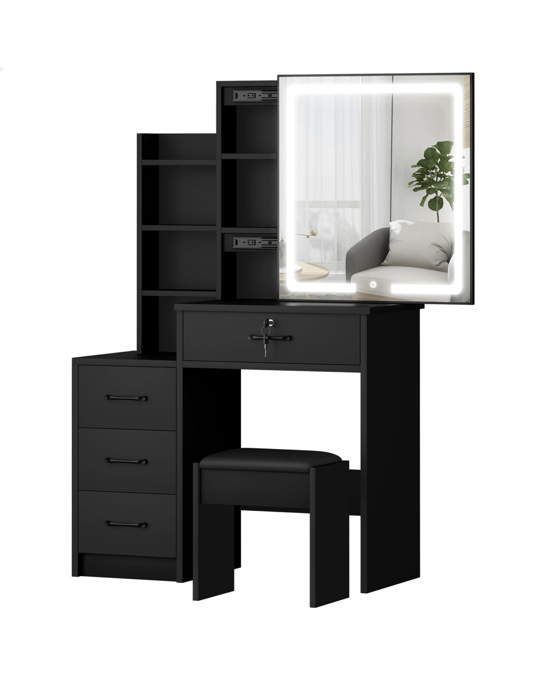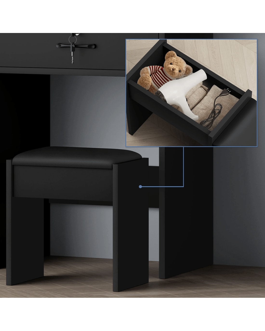 Comes with matching chair - The matching upholstered stool will provide you with a comfortable sitting position while applying make-up. Furthermore, the chair comes with lift-up lid for easy storage, which is a perfect spot for your blanket or hair-dryer.