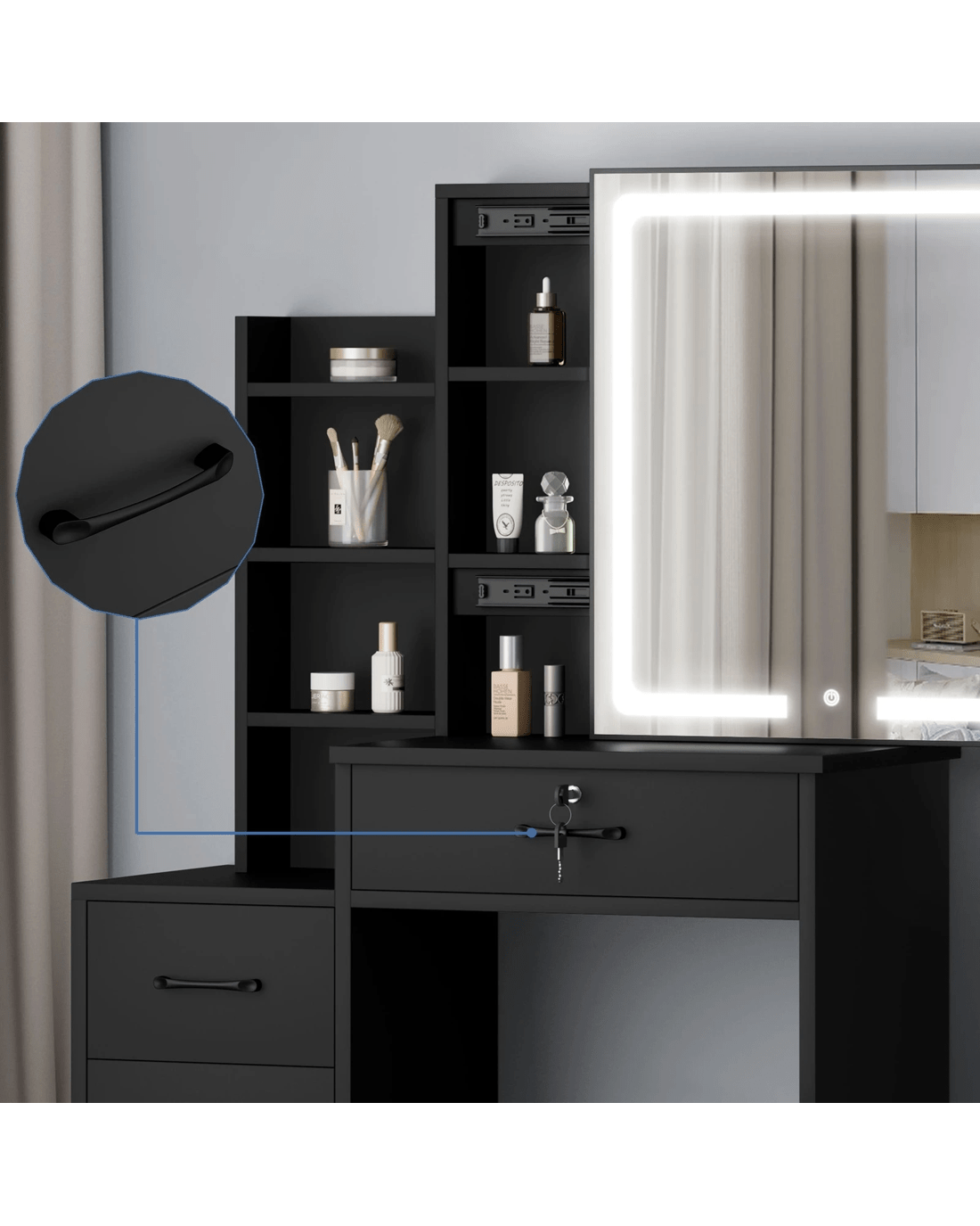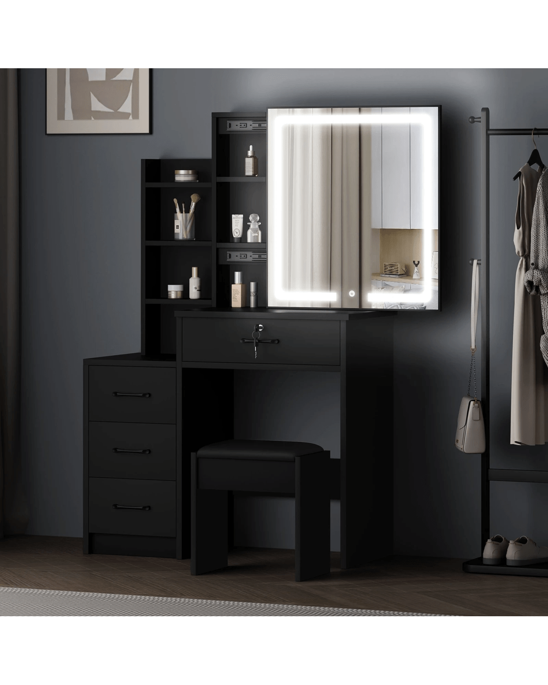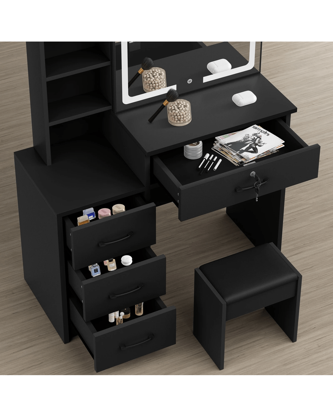 Keep your items organized - It features open shelves, 4 drawers and hidden shelving for ample storage space. For items you want to access easily, like make-up products, lotions, or perfumes, you can simply put them on desktop of table. For other items, like jewellery, you can store them away in drawers so they won't gather dust. Featuring a side cabinet, this dressing table can serve as nightstand next to your bed for Use -