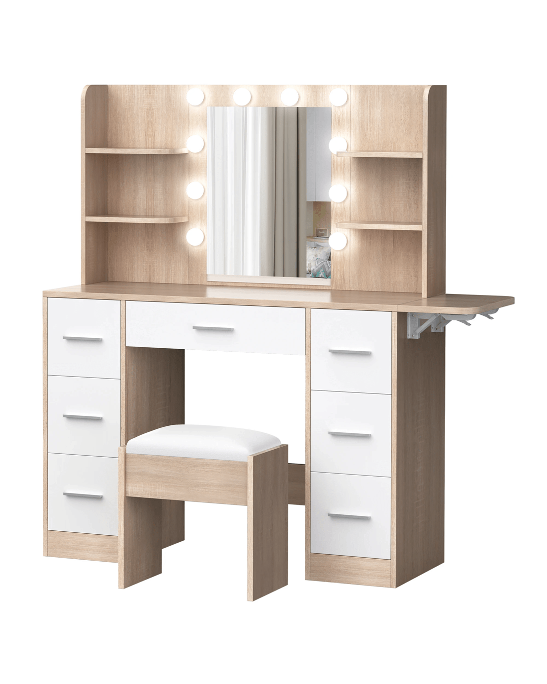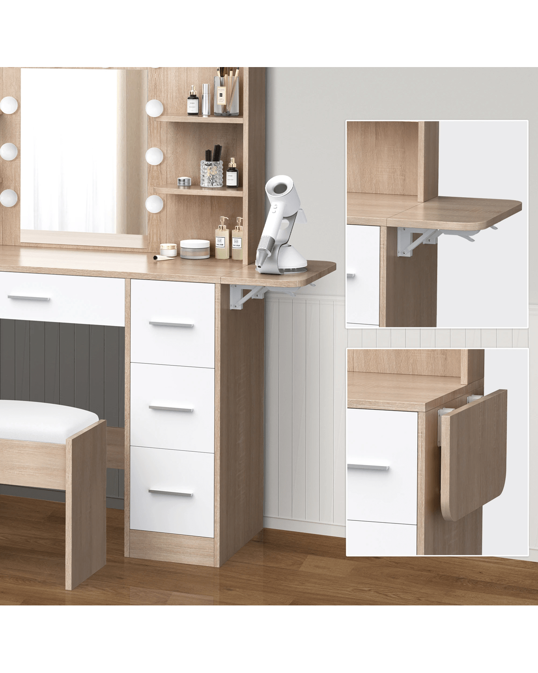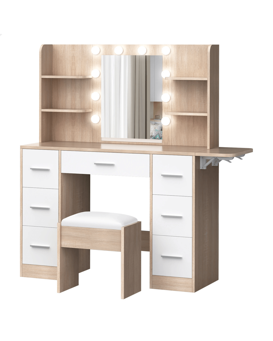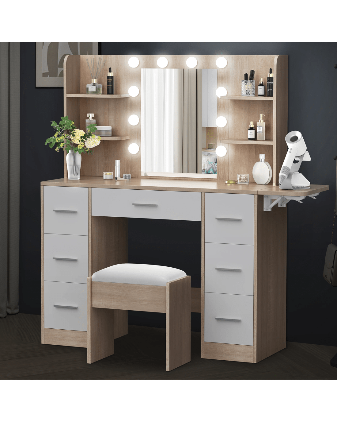 Keep your items organized - This dressing table features 7 drawers in different sizes and 6 open shelves for various storage options. For items you want to access easily, like make-up products, lotions, or perfumes, you can simply put them on desktop of table. For other items, like jewellery, you can store them away in drawers and cabinet so they won't gather dust. With remarkable convenience, there is a drop-leaf countertop which is easily extended for placing your hair-dryer or folded up when not in Use - p;providing flexibility in your beauty routine.