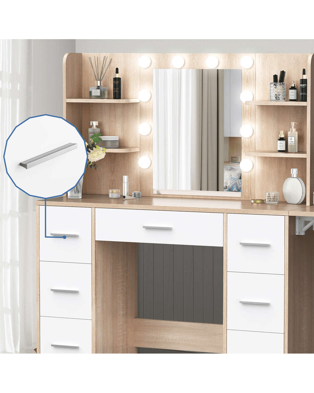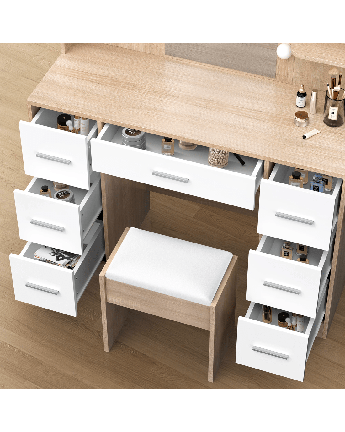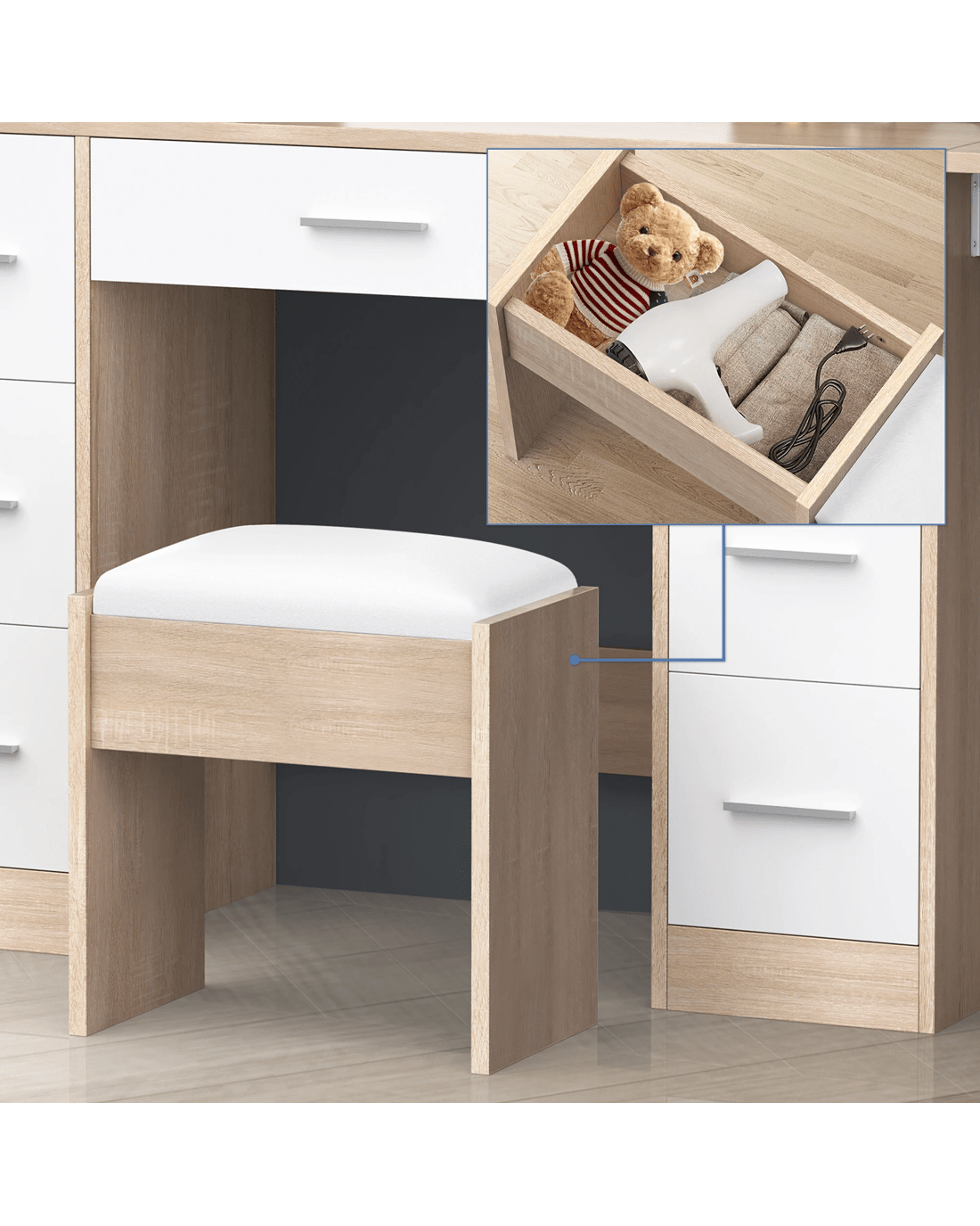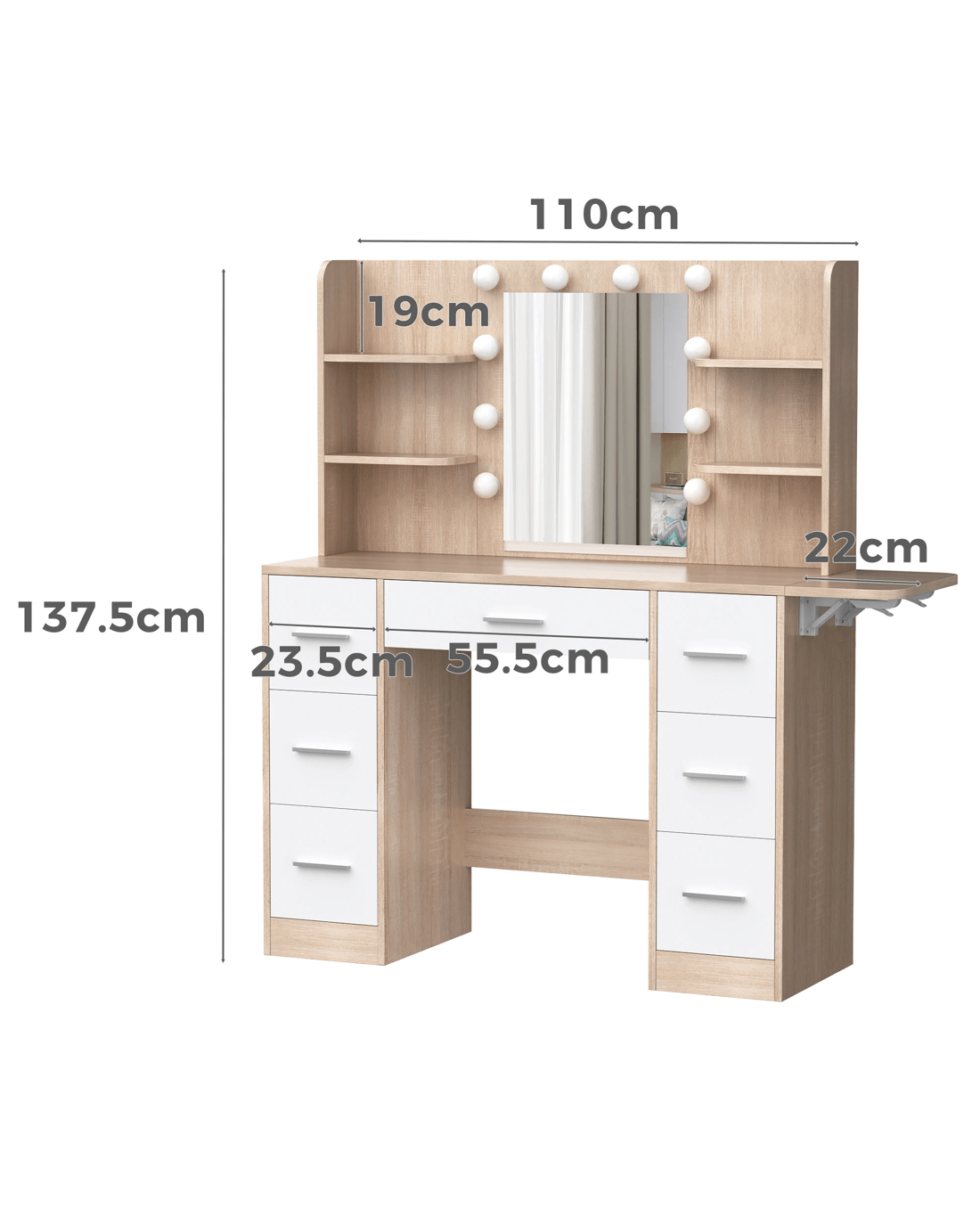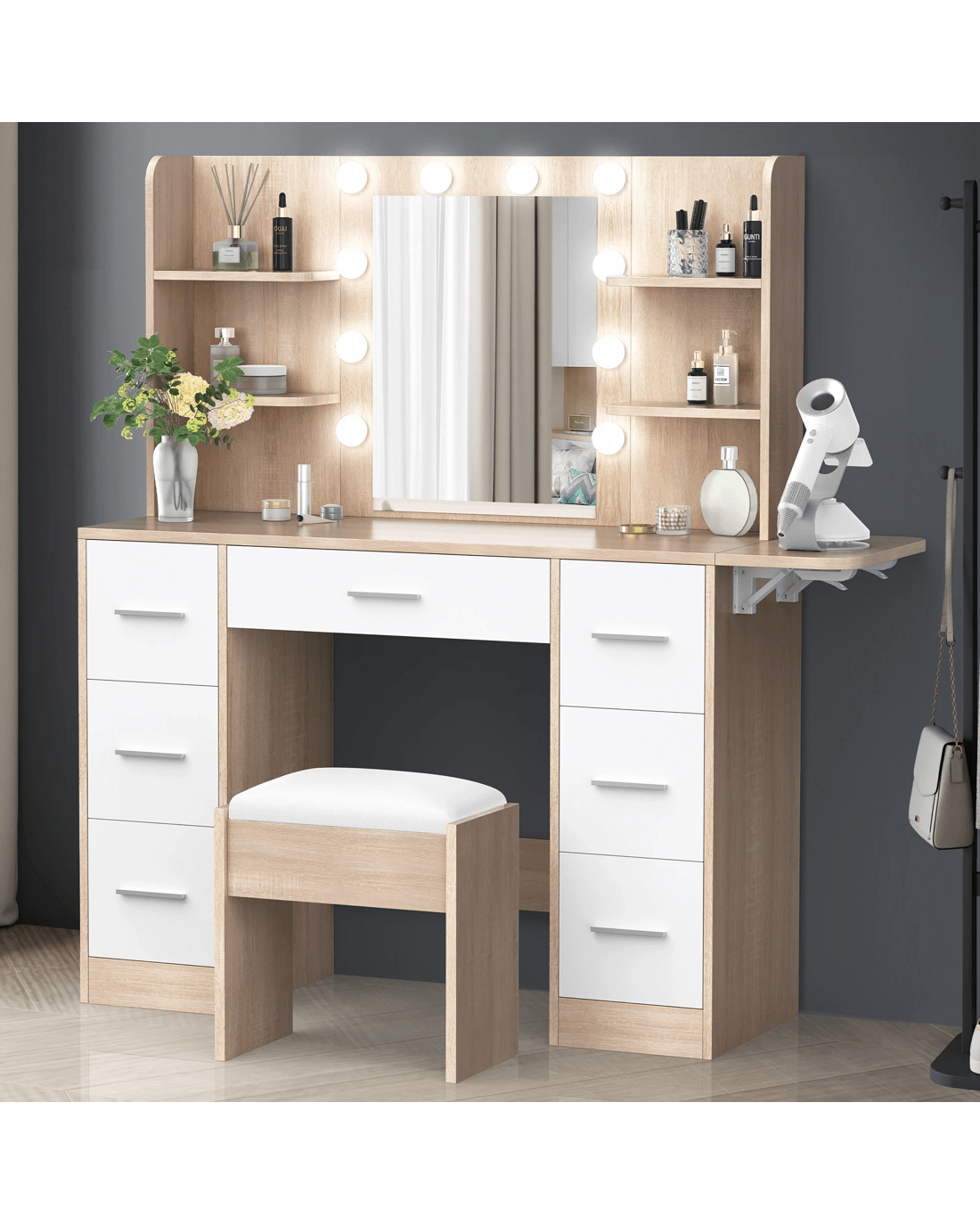 Keep your items organized - This dressing table features 7 drawers in different sizes and 6 open shelves for various storage options. For items you want to access easily, like make-up products, lotions, or perfumes, you can simply put them on desktop of table. For other items, like jewellery, you can store them away in drawers and cabinet so they won't gather dust. With remarkable convenience, there is a drop-leaf countertop which is easily extended for placing your hair-dryer or folded up when not in Use - p;providing flexibility in your beauty routine.
