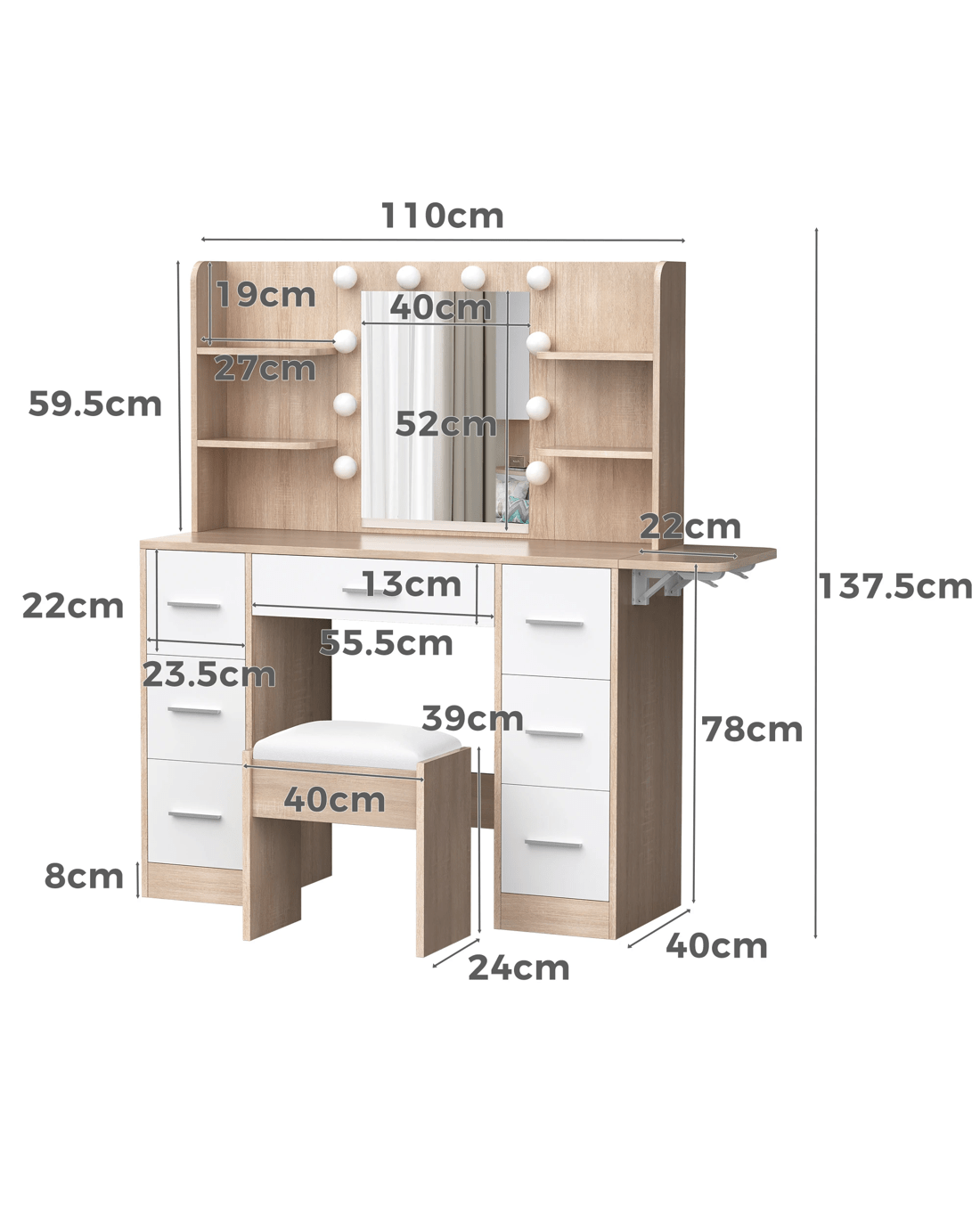Sold by Aussie Union GroupAlfordson Dressing Table Stool Set Makeup Mirror Vanity Desk LED Bulbs - Oak