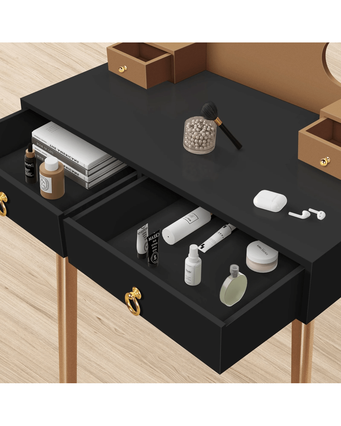 Keep your items organized - It features 4 drawers in different sizes to organize your personal items. For items you want to access easily, like make-up products, lotions, or perfumes, you can simply put them on desktop of table. For other items, like jewellery, you can store them away in drawers so they won't gather dust.