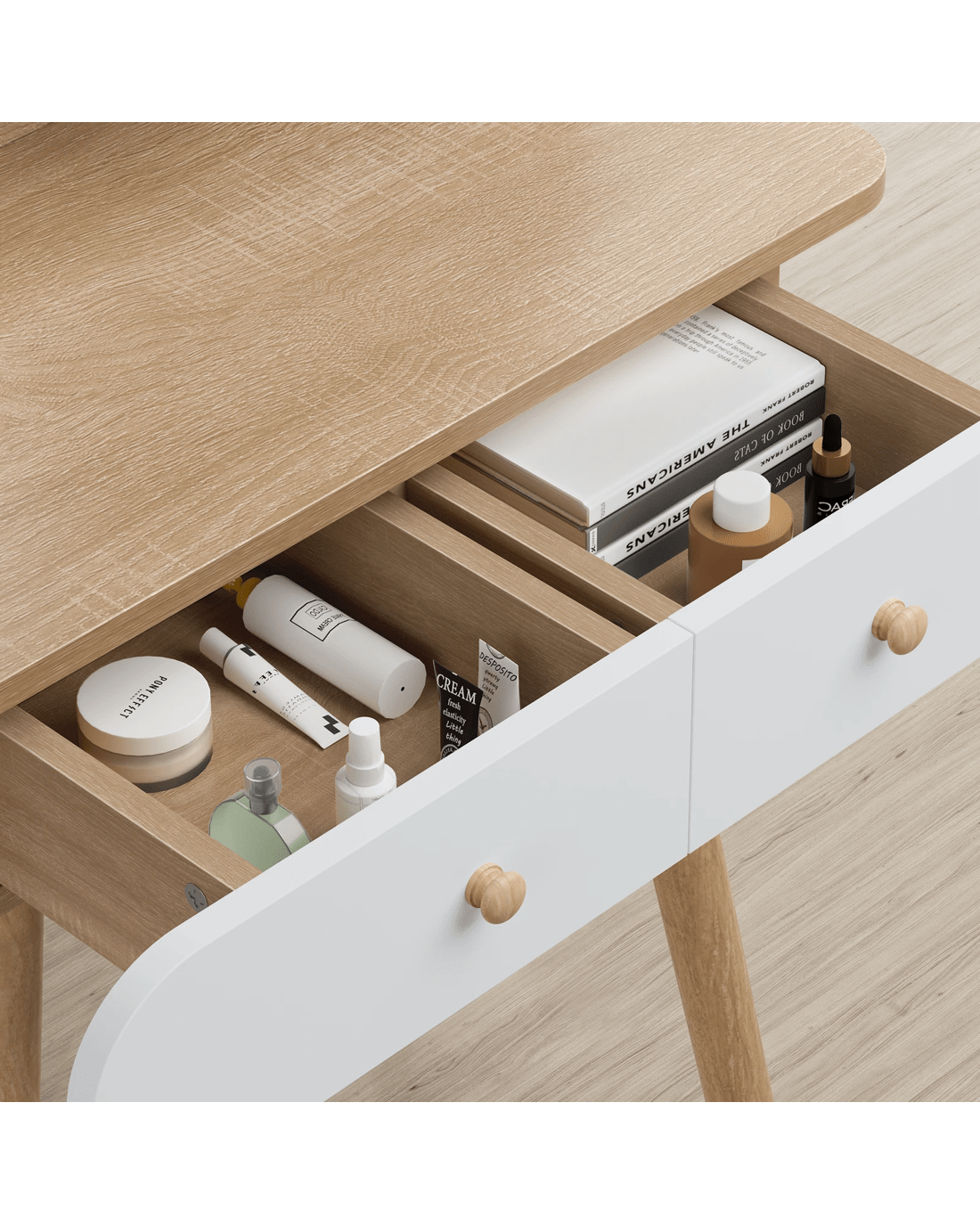 Keep your items organized - It features 2 drawers and multiple shelves to organize your personal items. For items you want to access easily, like make-up products, lotions, or perfumes, you can simply put them on desktop of table. For other items, like jewellery, you can store them away in drawers so they won't gather dust.