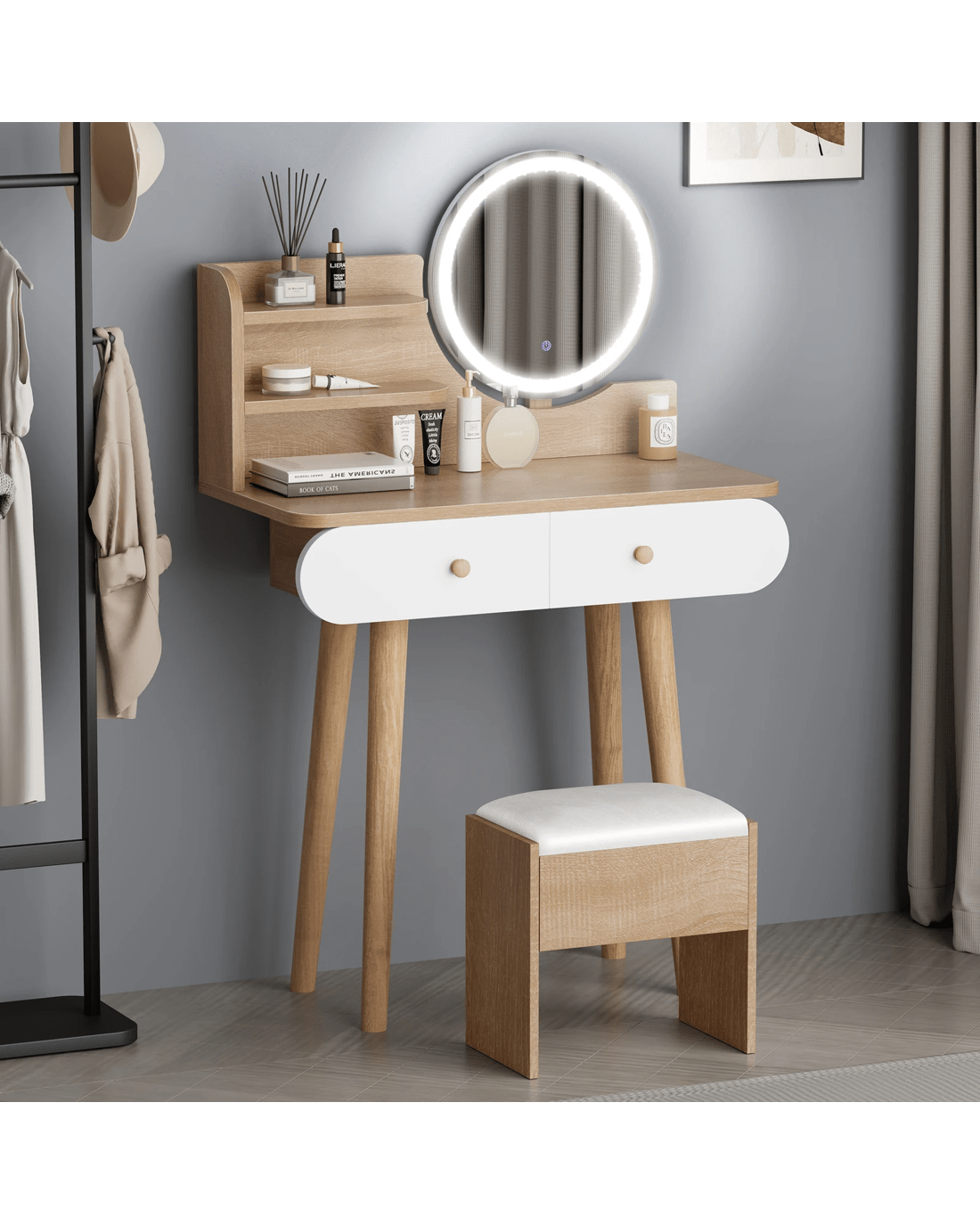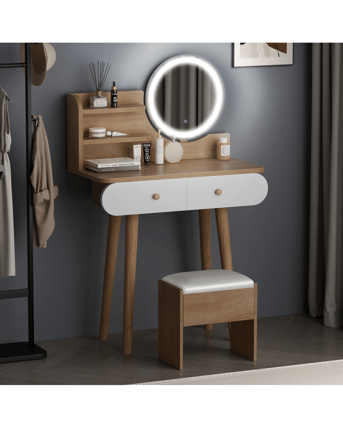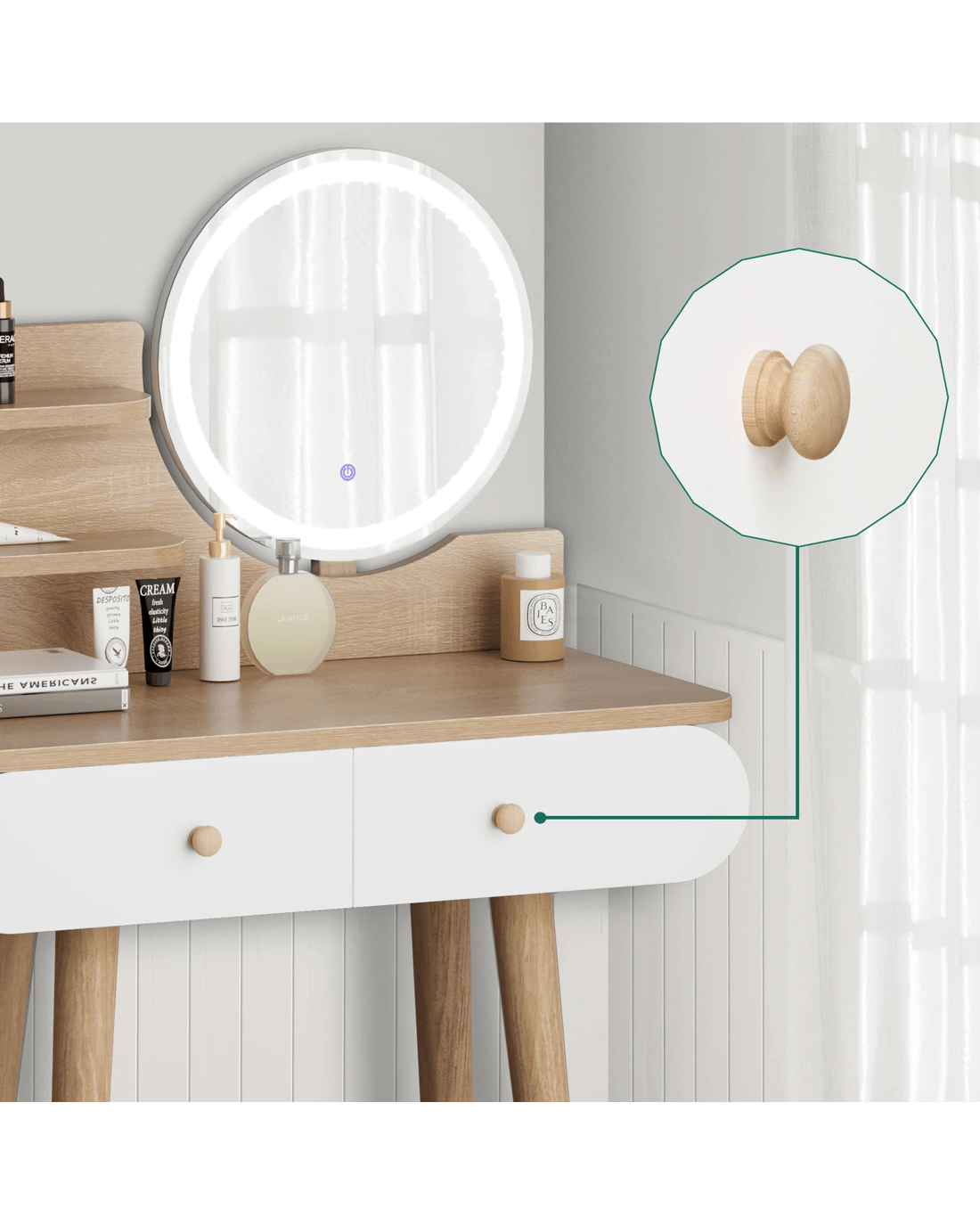 Customizable lighting - Good lighting is important to achieve your perfect glam look. The dressing table features 3 LED light colours - neutral white, warm white, and daylight white and the brightness of each colour can be adjusted in 10 levels, providing adequate light to complete your make-up.
