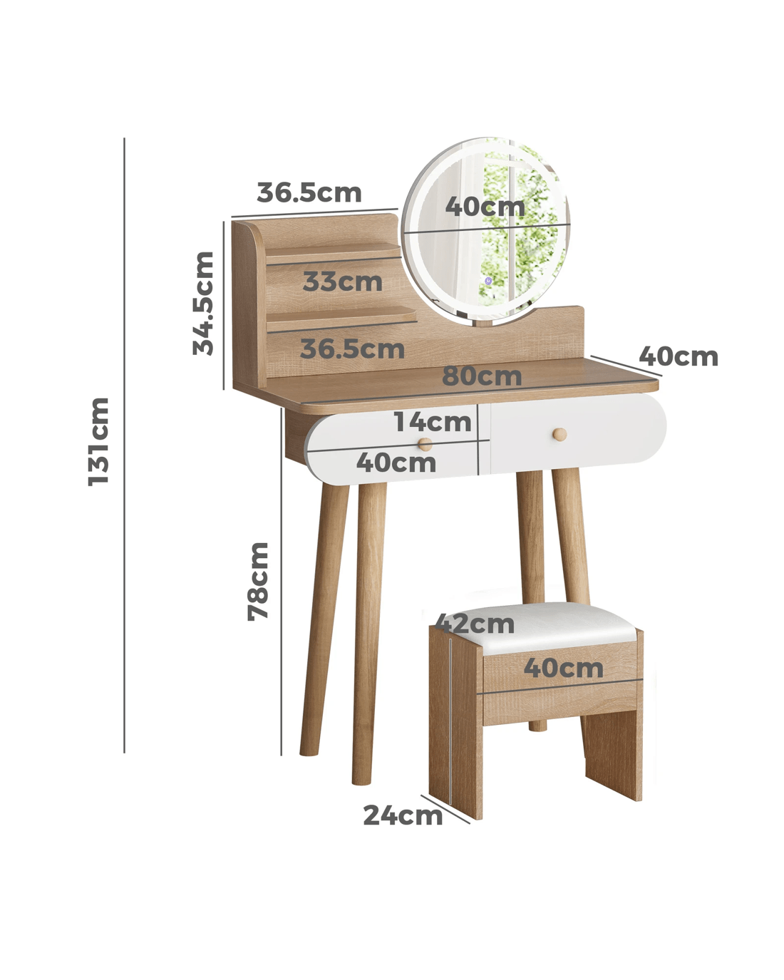 Overall dimensions: 80cm x 40cm x 131cm (refer to dimension photo for detailed sizes)
