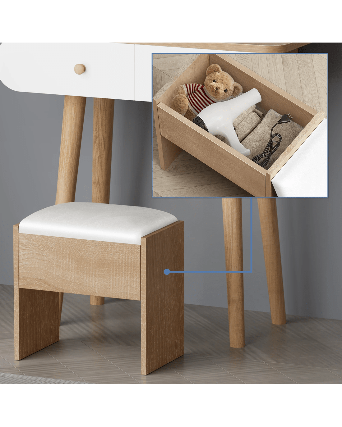 Comes with matching chair matching upholstered stool will provide you with a comfortable sitting position while applying make-up. Furthermore, the chair comes with lift-up lid for easy storage, which is a perfect spot for your blanket or hair-dryer.