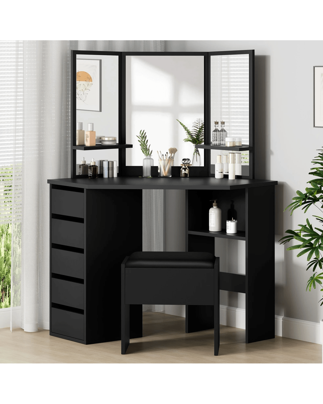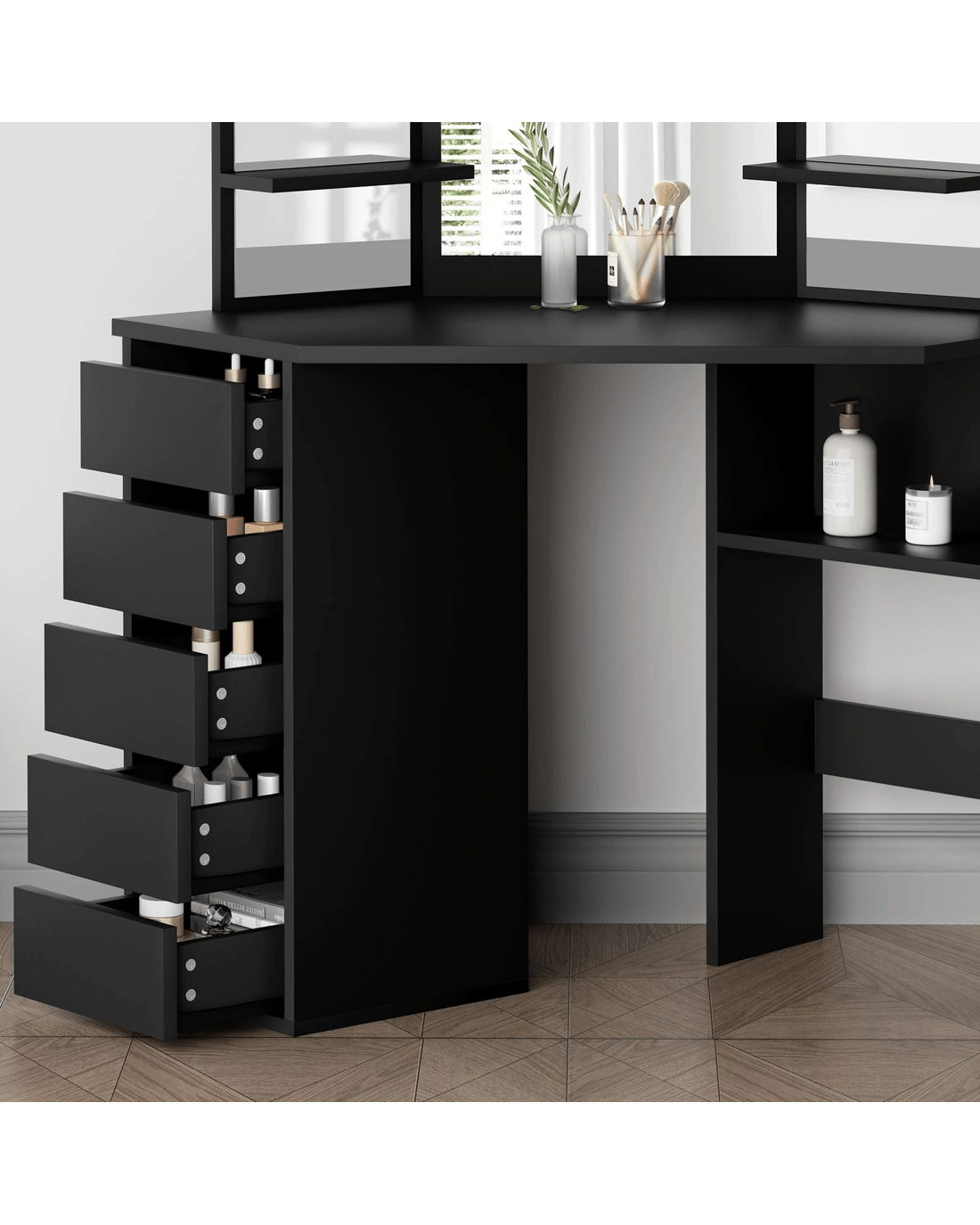 Keep your items organized - It features 5 drawers in different sizes and open shelves for various storage options. For items you want to access easily, like make-up products, lotions, or perfumes, you can simply put them on desktop of table. For other items, like jewellery, you can store them away in drawers so they won't gather dust.