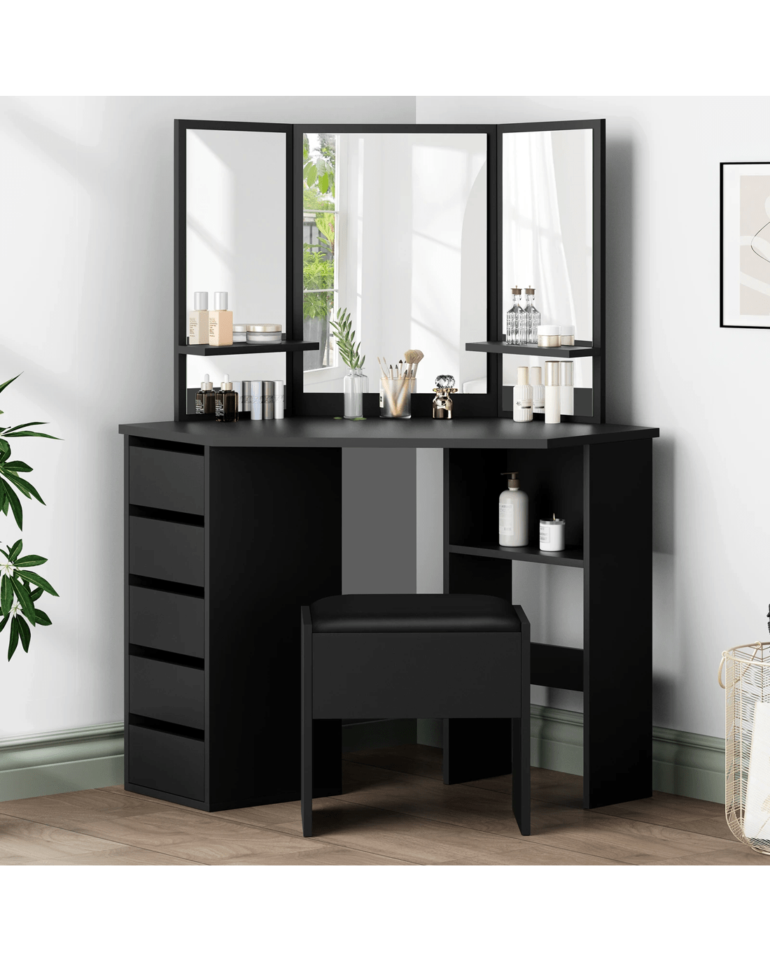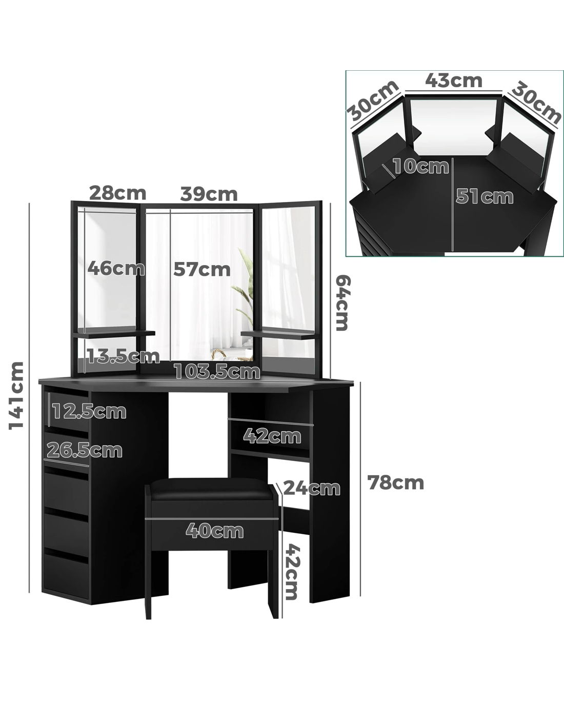 Sold by Aussie Union GroupAlfordson Dressing Table Stool Set Makeup Tri-fold Mirror Vanity Desk - Black