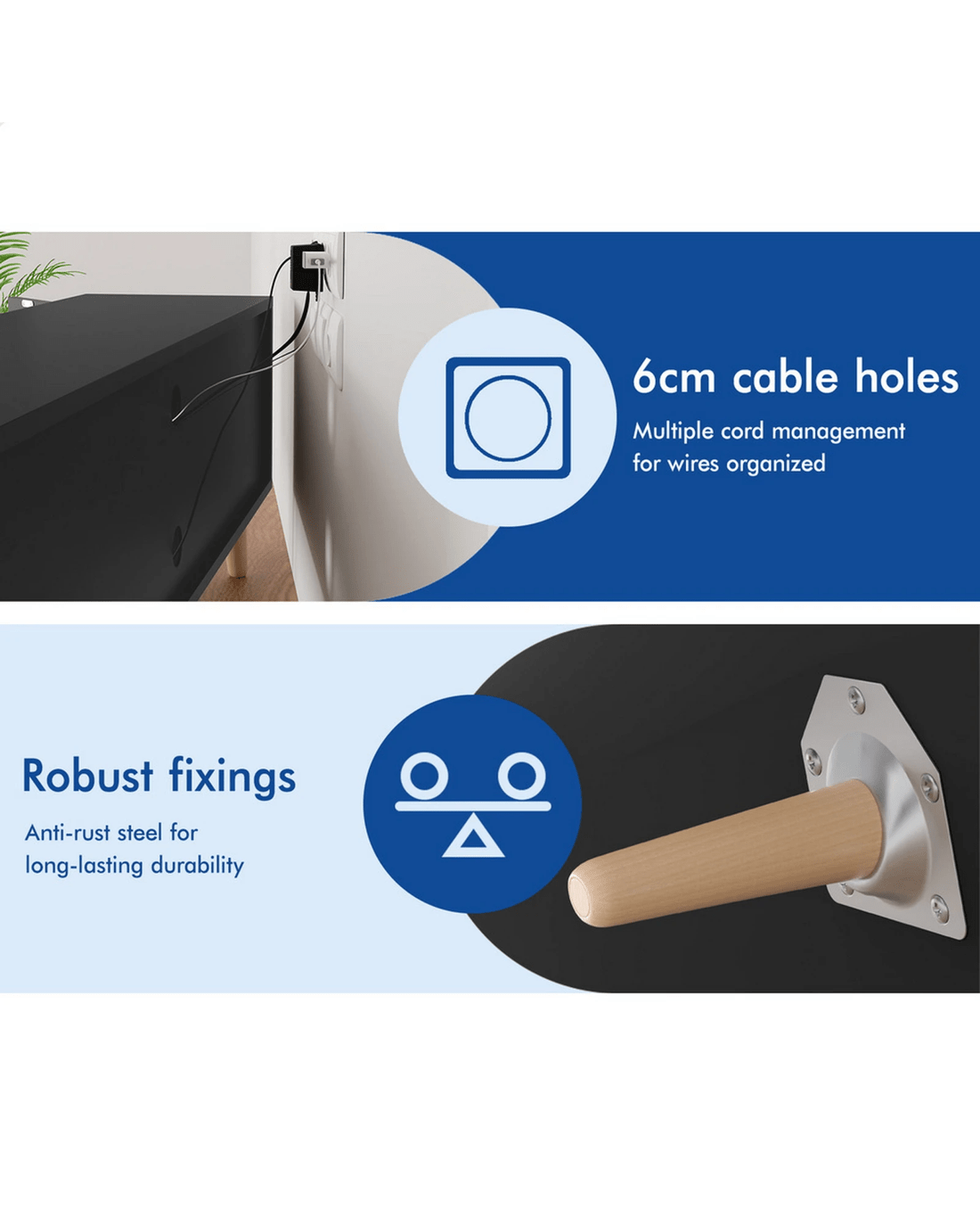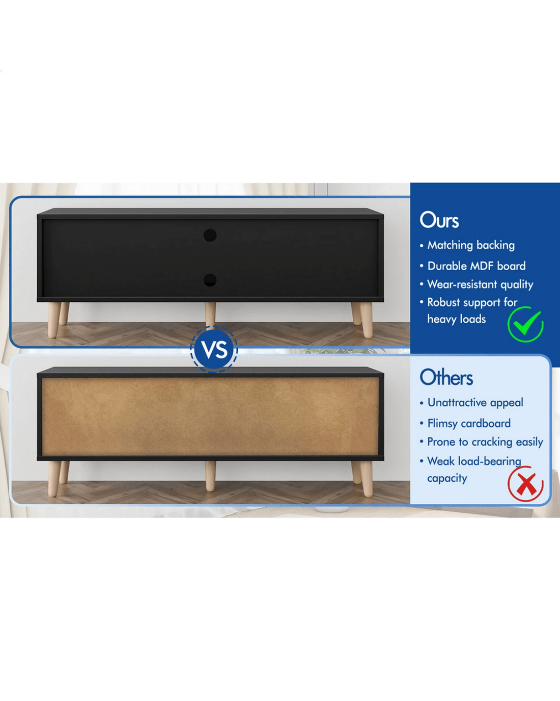 Structural stability - Made of superior E1 grade and 15mm thick particle board, our entertainment unit is durable and resistant to scratches. Instead of flimsy paper finish, it is well made with smooth melamine finish which is easy to maintain and long lasting. Equipped with qualified sliding rails, the drawers quietly open and close so you can access your items with ease.
