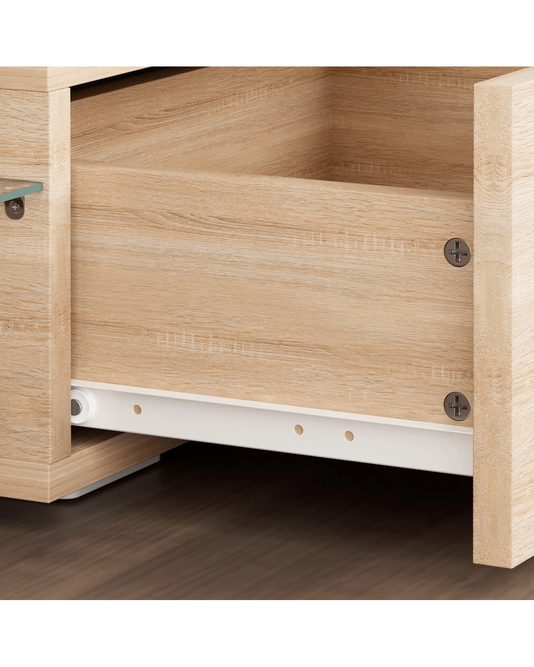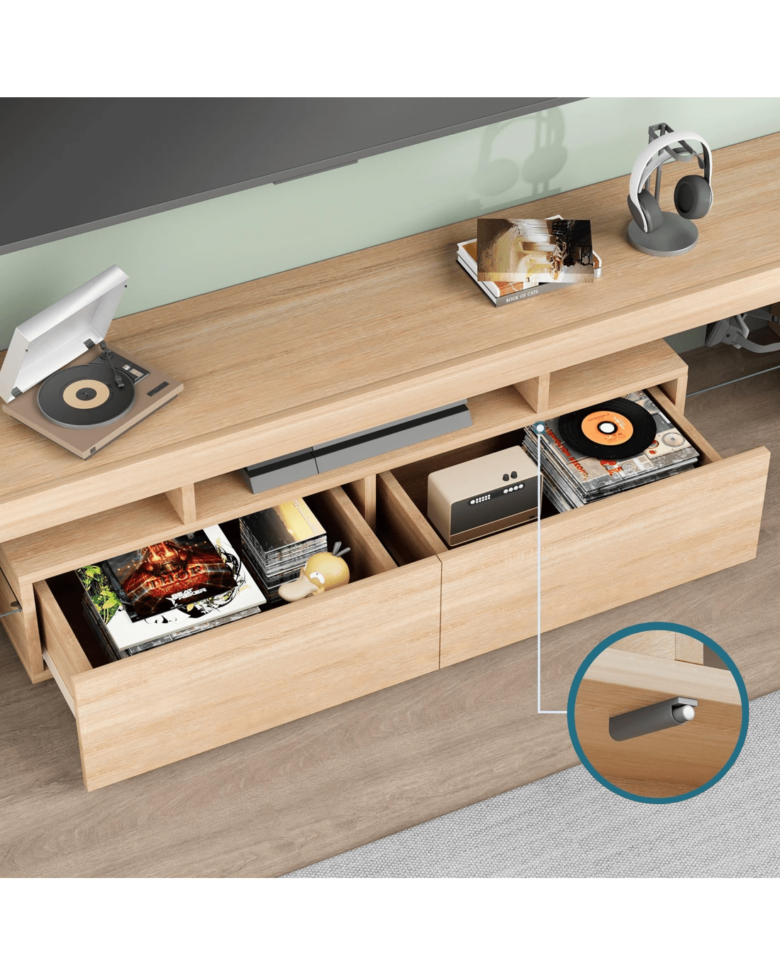 Reliable quality - Made of superior E1 grade and 15mm thick particle board, our entertainment unit is durable and resistant to scratches. Instead of flimsy paper finish, it is well made with smooth melamine finish which is easy to maintain and long lasting. Equipped with push-to-open system, the drawers quietly open and close so you can access your items with ease.
