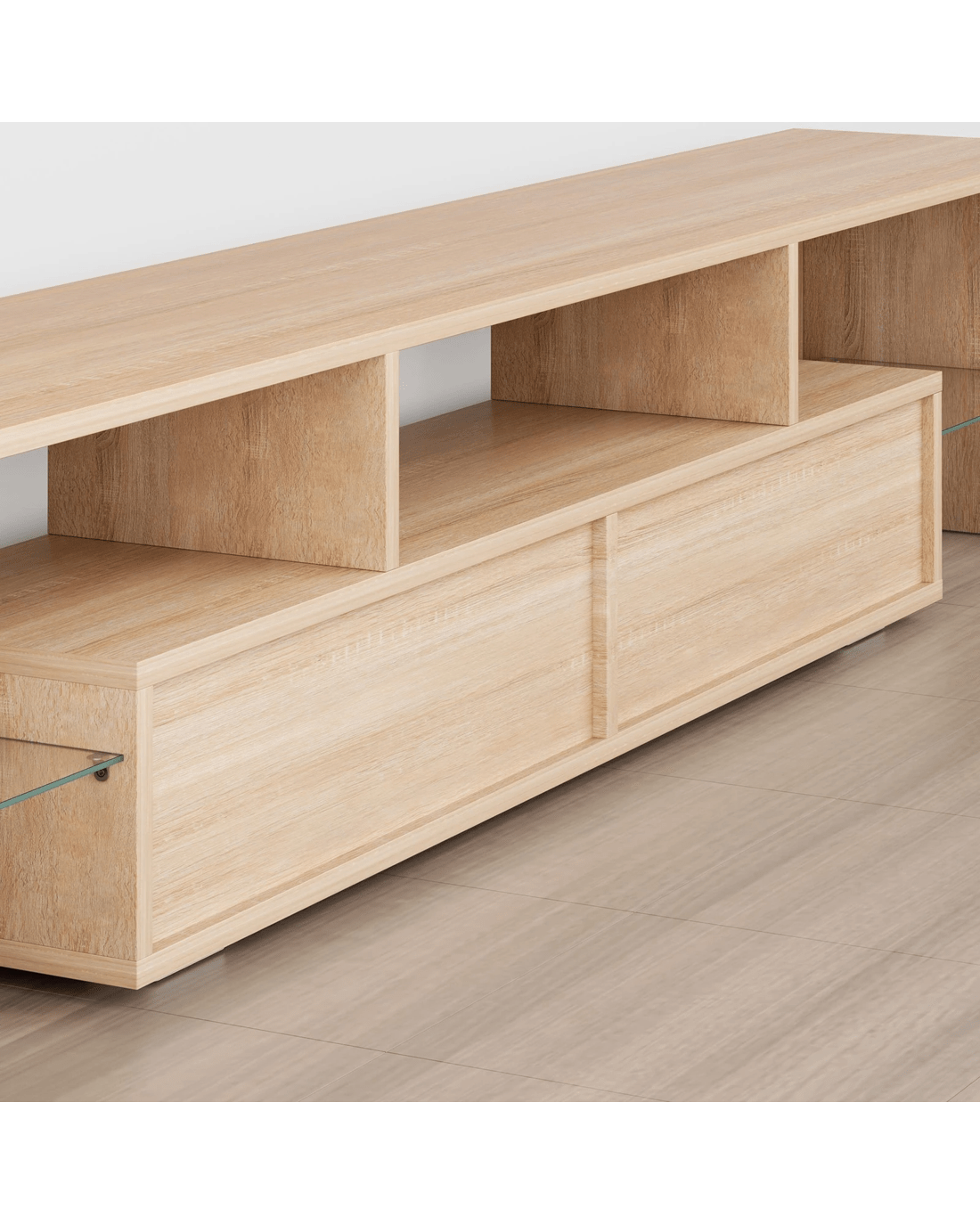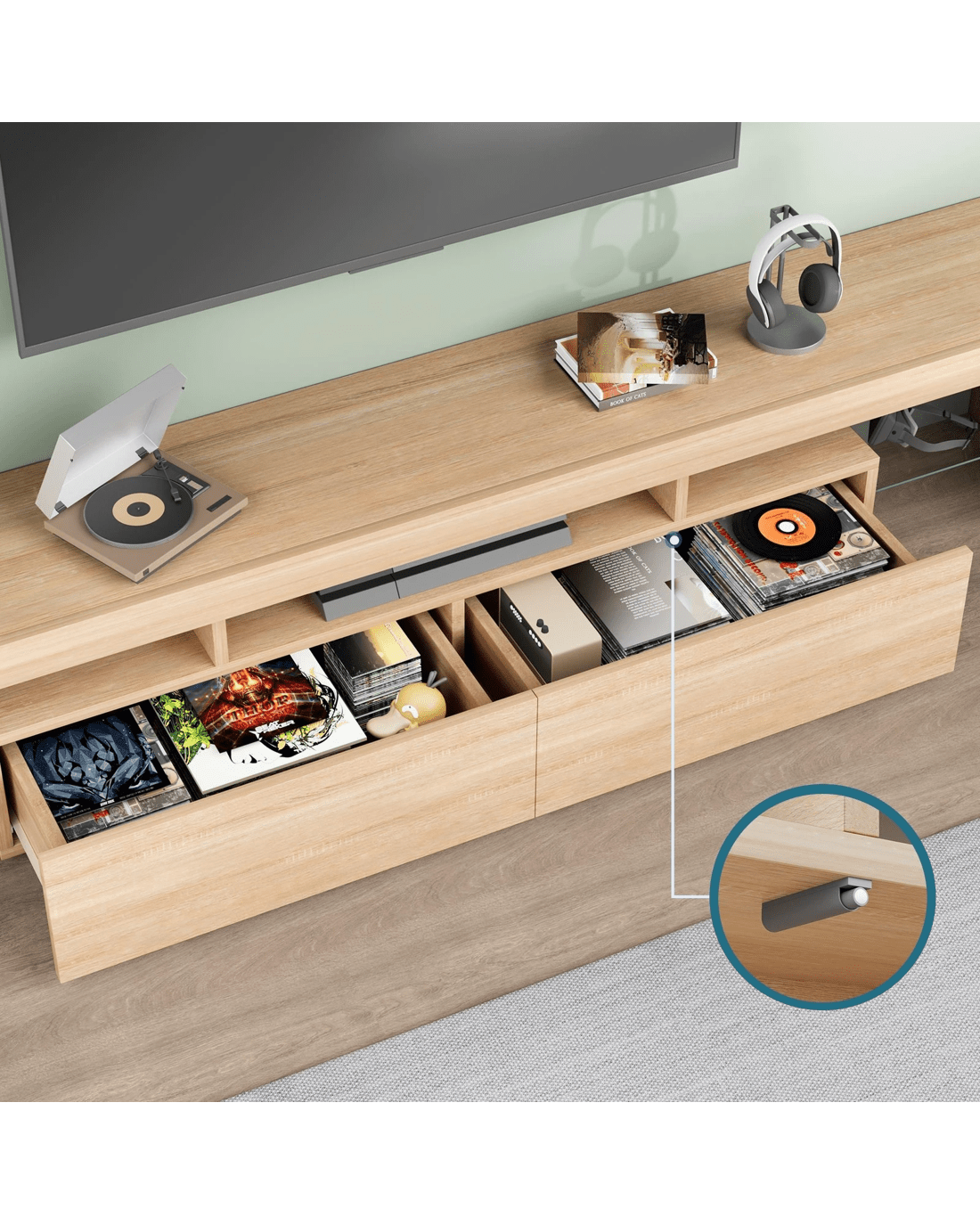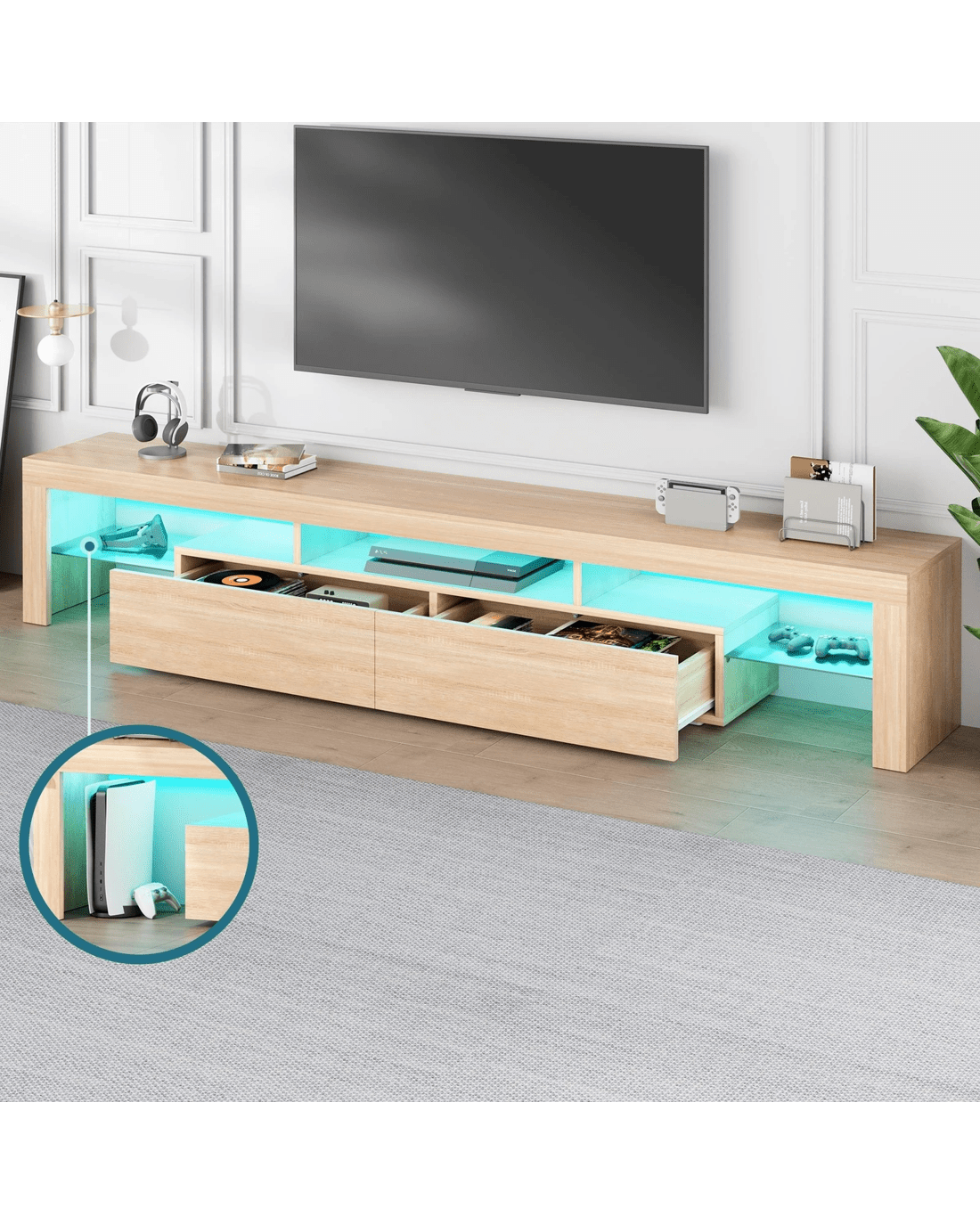 Reliable quality - Made of superior E1 grade and 15mm thick particle board, our entertainment unit is durable and resistant to scratches. Instead of flimsy paper finish, it is well made with melamine and UV high gloss finish which is easy to maintain and long lasting. Equipped with push-to-open system, the drawers quietly open and close so you can access your items with ease.