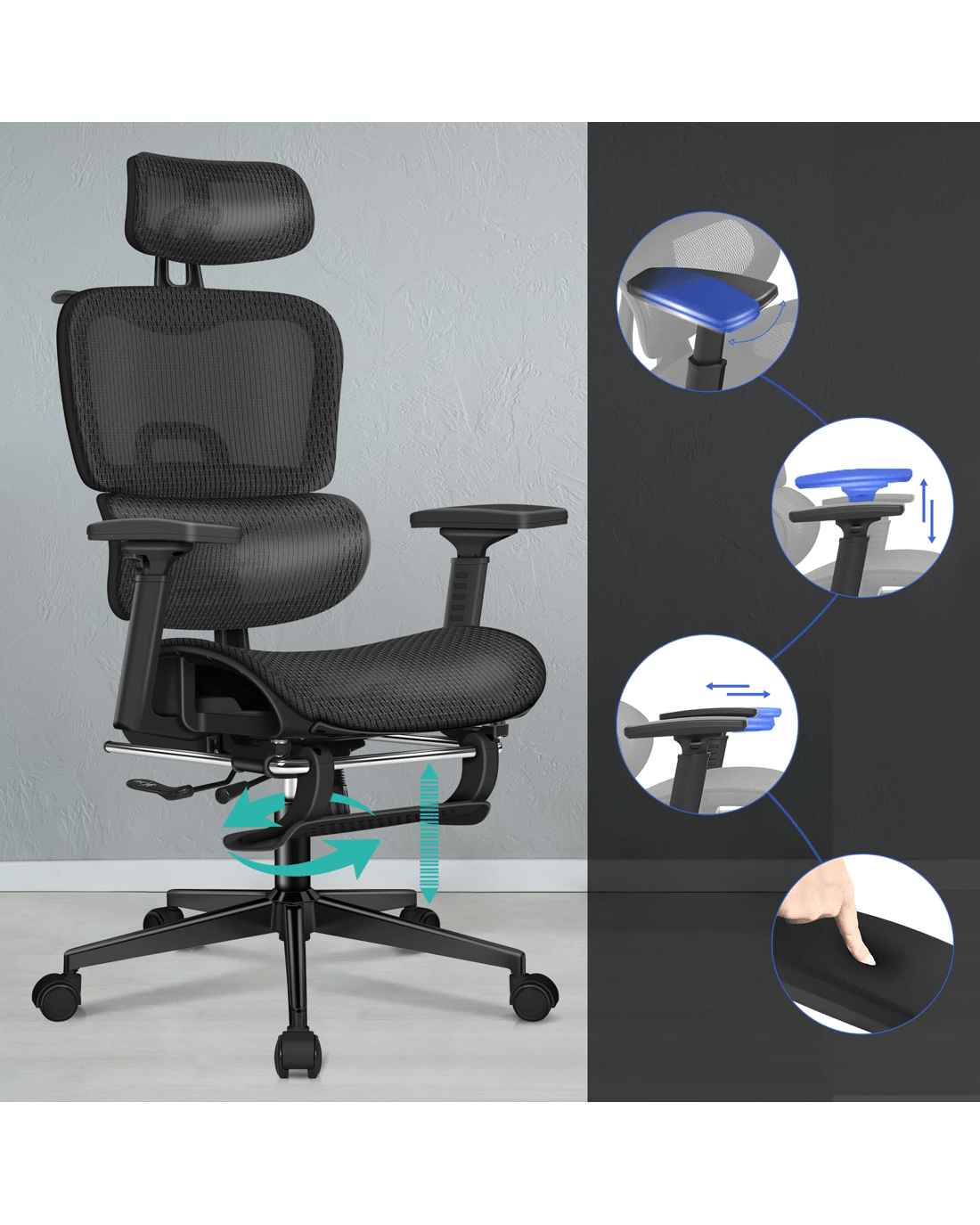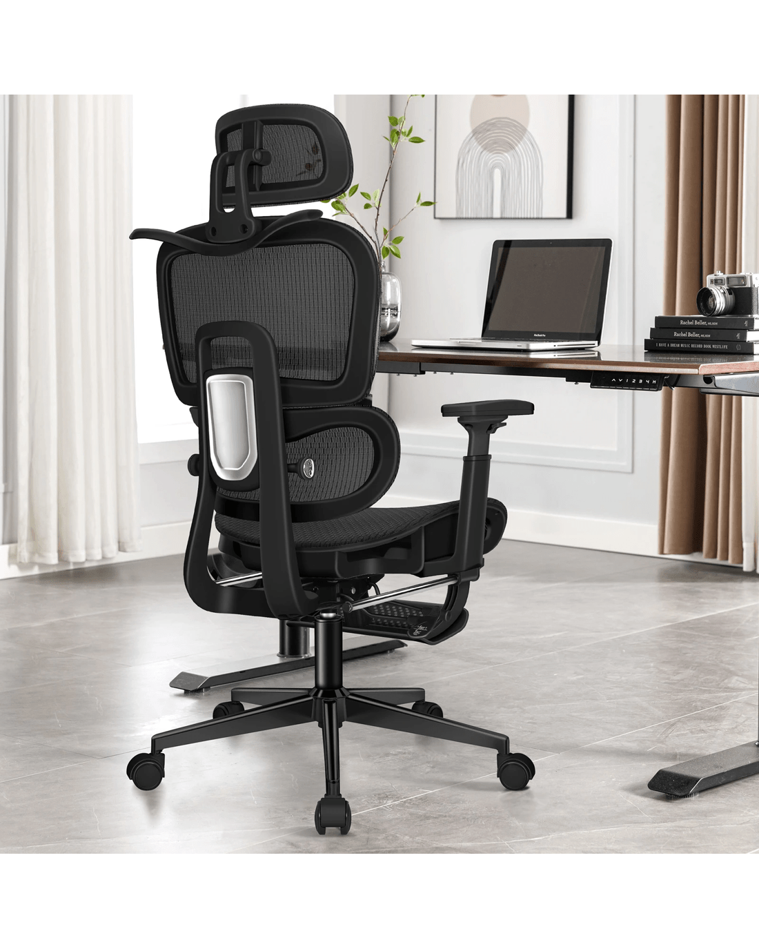 Flexible 3D armrests - Smooth, precise adjustments in three directions with a refined internal mechanism. Raise or rotate the armrests to be level with your desk for effective support for your wrists and elbows, or slide them under when you need to sit forward.