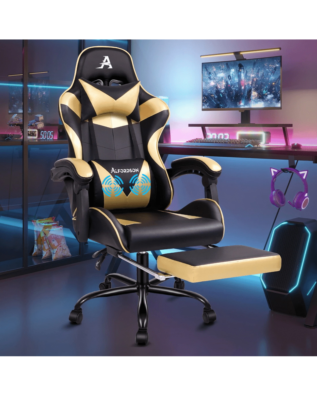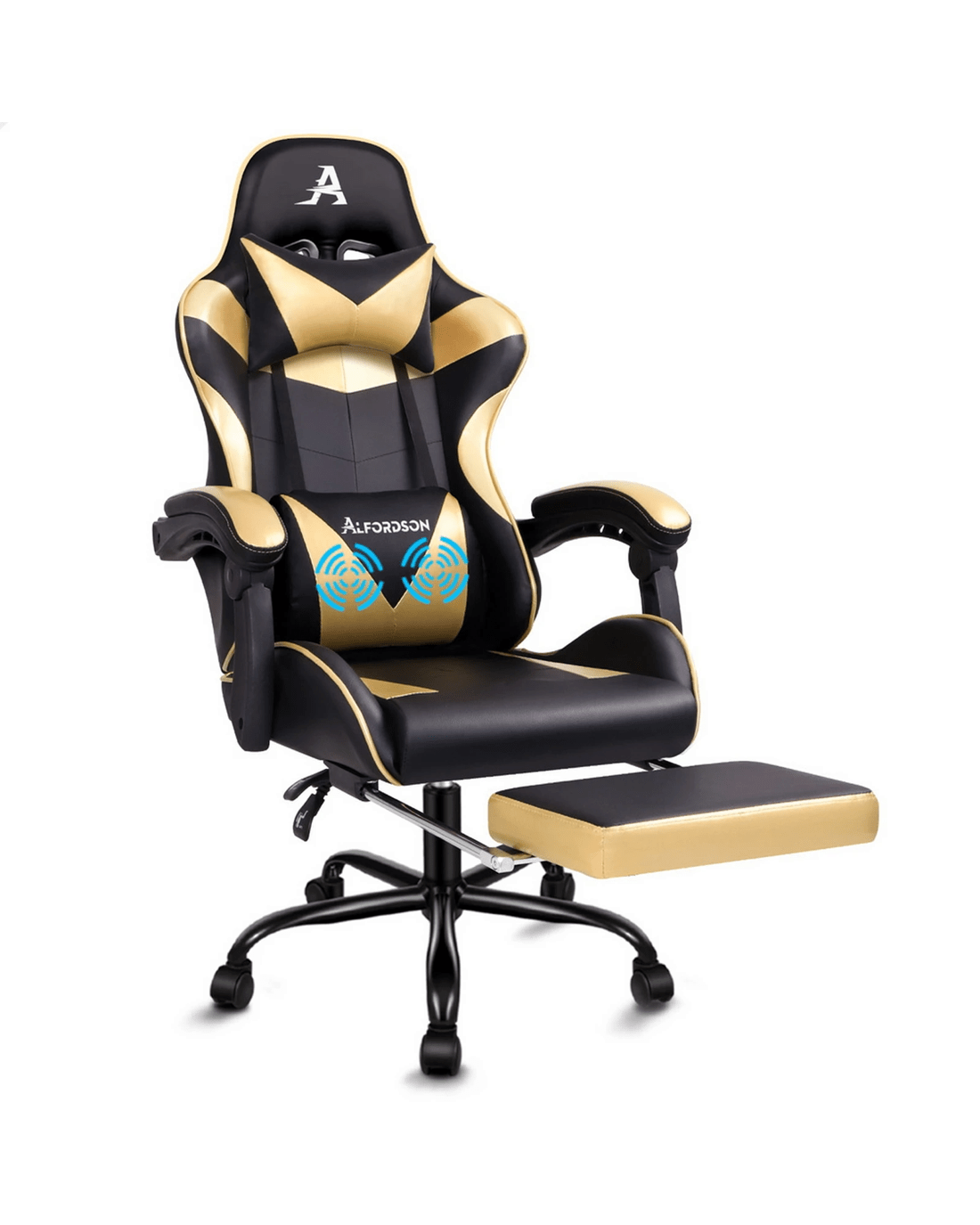 The Alfordson supreme gaming office chair is born for serious gamer, and the smart working executive who loves the adrenaline of residing in a gaming chair. Our all-metal frame racer chair is the ultimate for movers and shakers like yourself. Combined with retractable padded footrest that suits your personalized positions while sitting, sleeping or playing games. Its detachable and height-adjustable lumbar and neck cushions offers perfect support to make you relaxed. It features a sturdy chrome base with up to 150 degree back recline adjustment and 360 degree swivel, you can lock the position of reclination as you wish. Premium PU leather ensures optimal durability and easy cleaning.