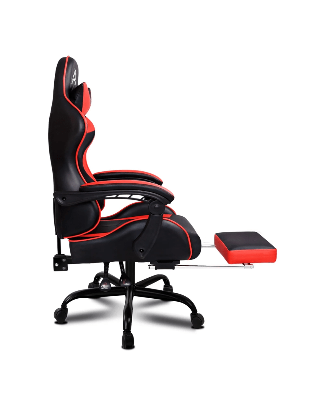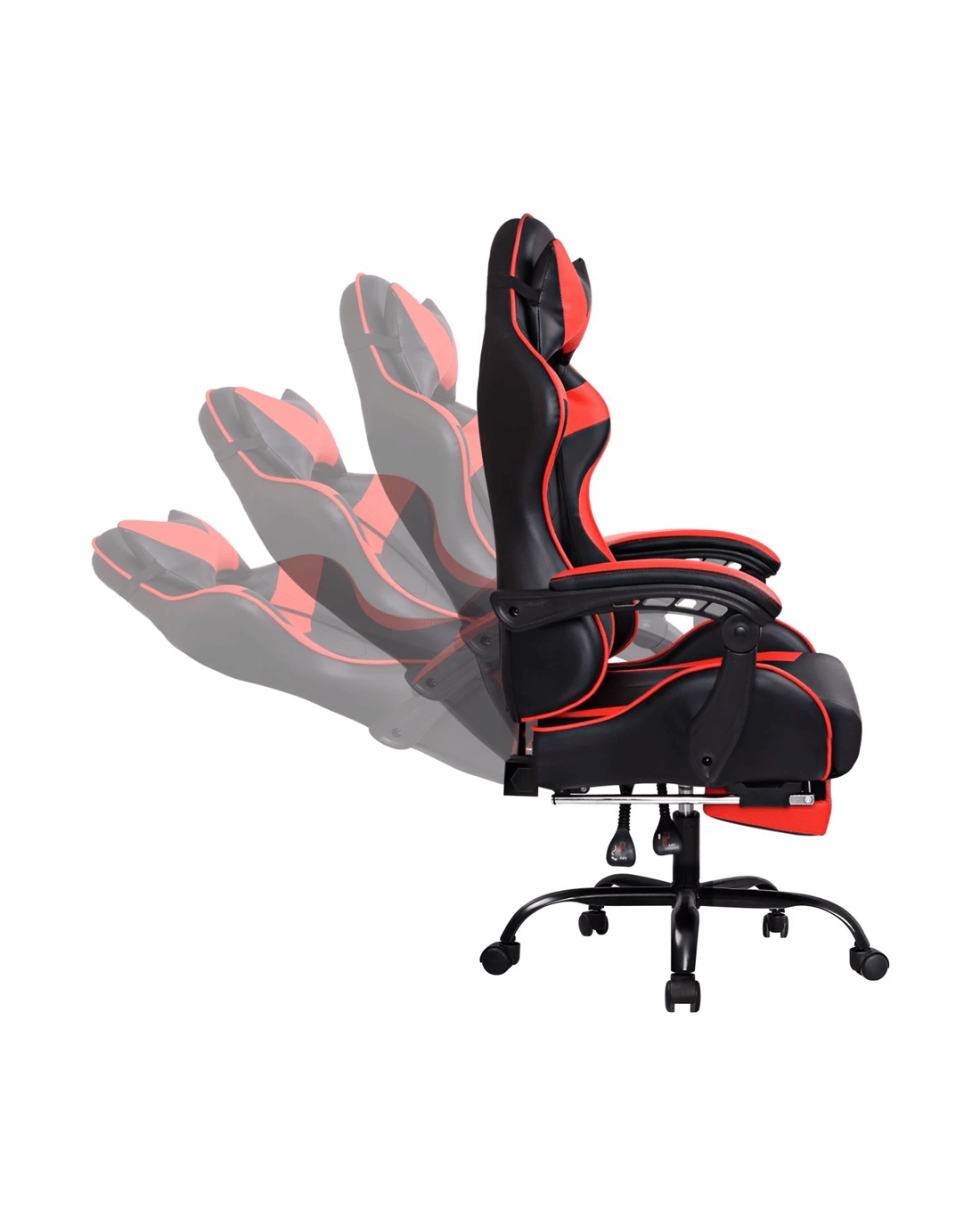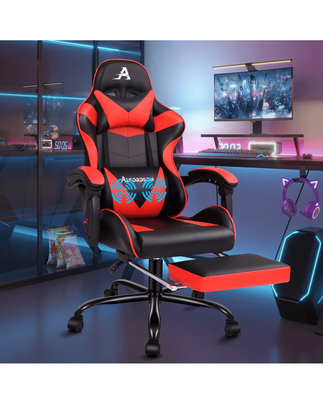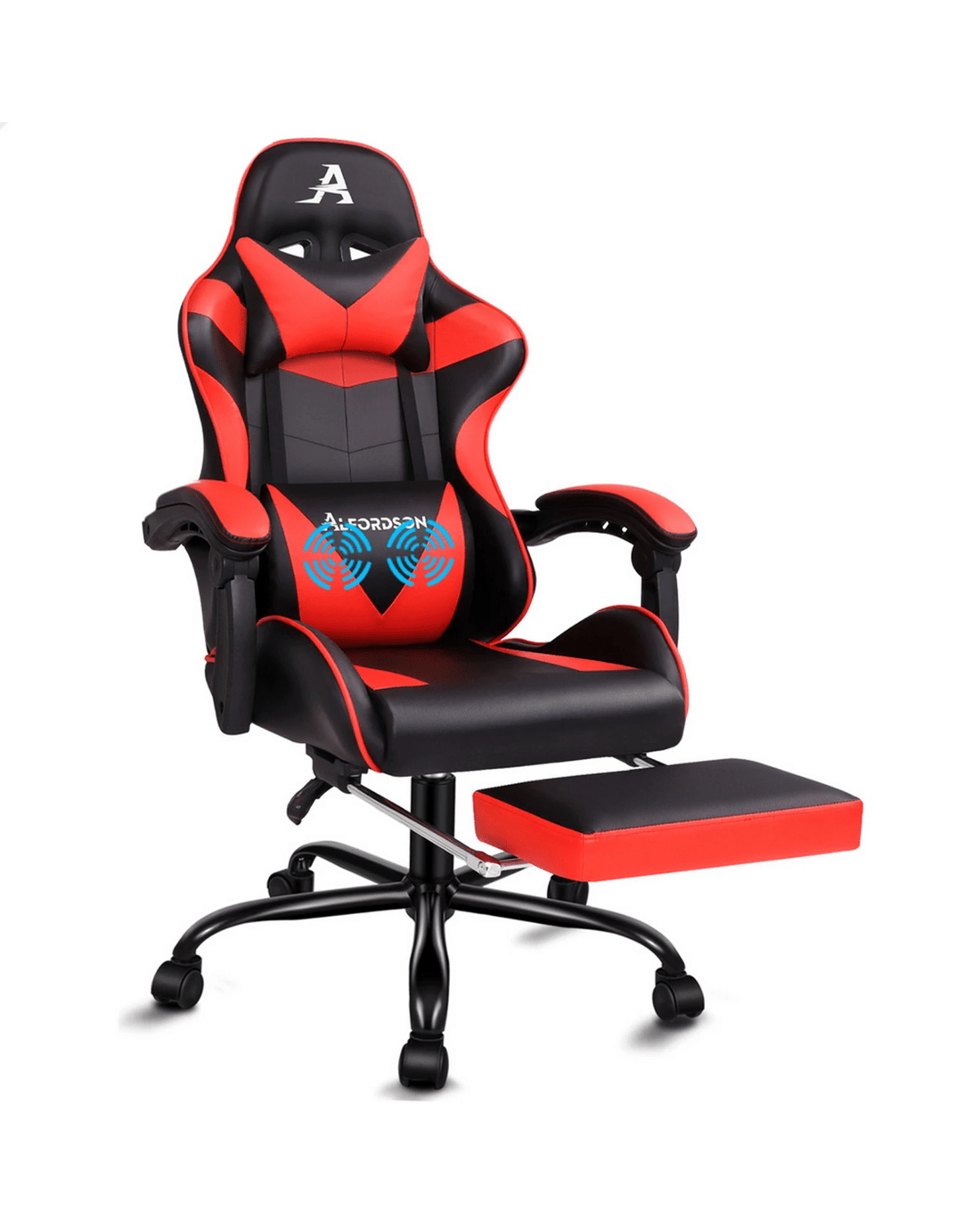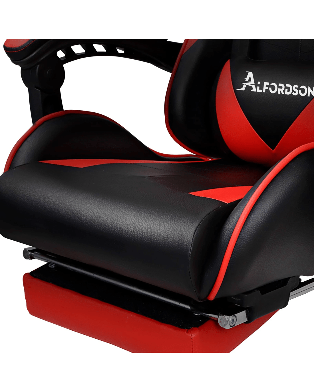 The Alfordson supreme gaming office chair is born for serious gamer, and the smart working executive who loves the adrenaline of residing in a gaming chair. Our all-metal frame racer chair is the ultimate for movers and shakers like yourself. Combined with retractable padded footrest that suits your personalized positions while sitting, sleeping or playing games. Its detachable and height-adjustable lumbar and neck cushions offers perfect support to make you relaxed. It features a sturdy chrome base with up to 150 degree back recline adjustment and 360 degree swivel, you can lock the position of reclination as you wish. Premium PU leather ensures optimal durability and easy cleaning.