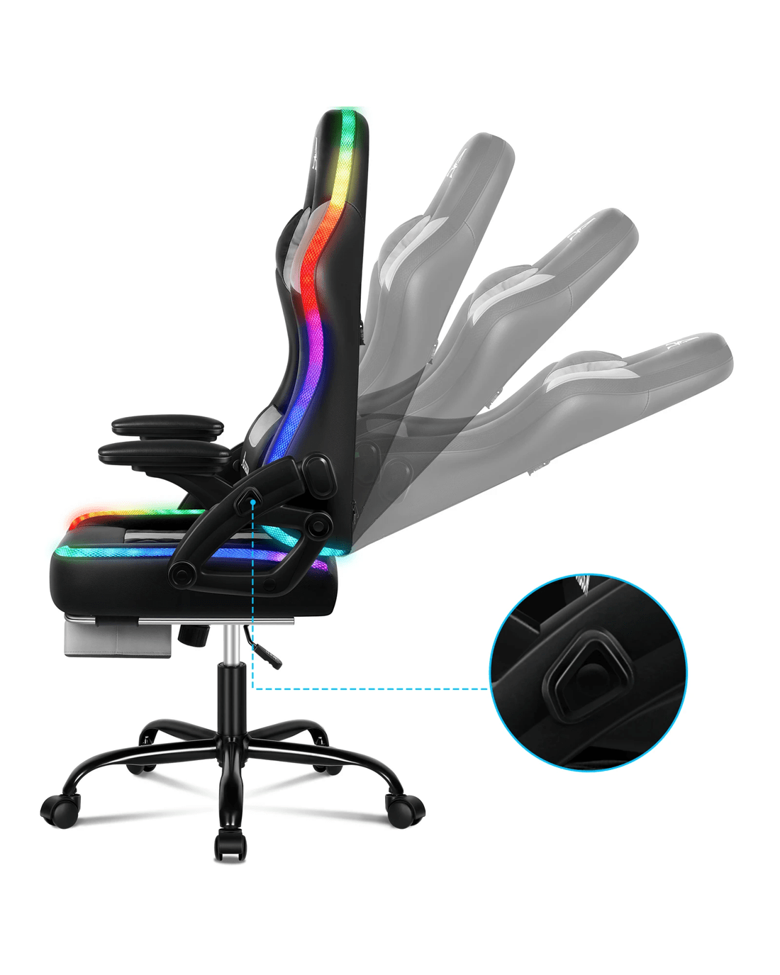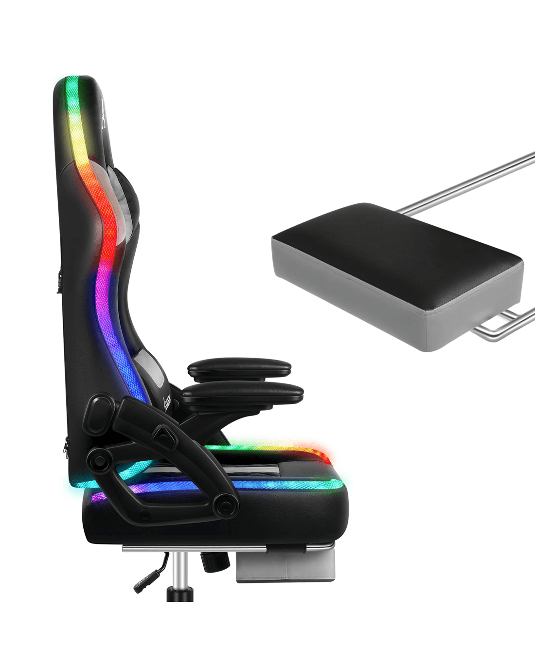 The ergonomic gaming chair is combined with retractable padded footrest that suits your personalized positions while sitting, sleeping, working or playing games. An elite in quality and design, your solution to true comfort.