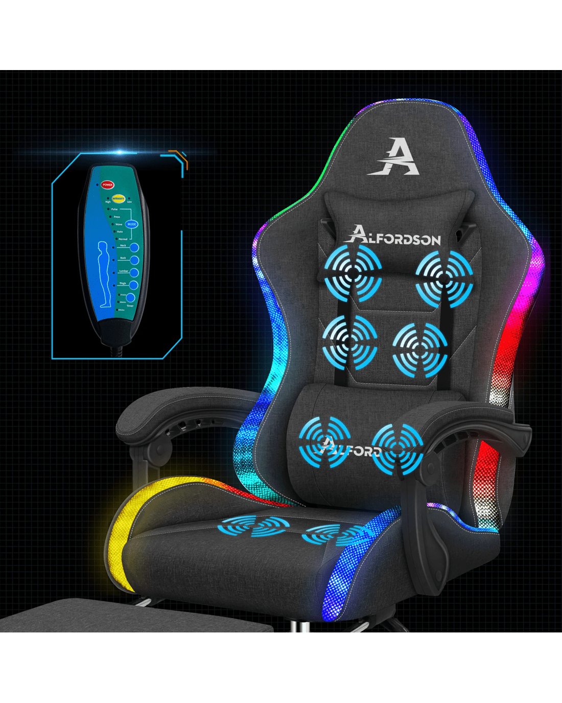 Sold by Aussie Union GroupAlfordson Gaming Chair Office Massage 12 RGB LED Computer Seat Fabric - Dark Grey