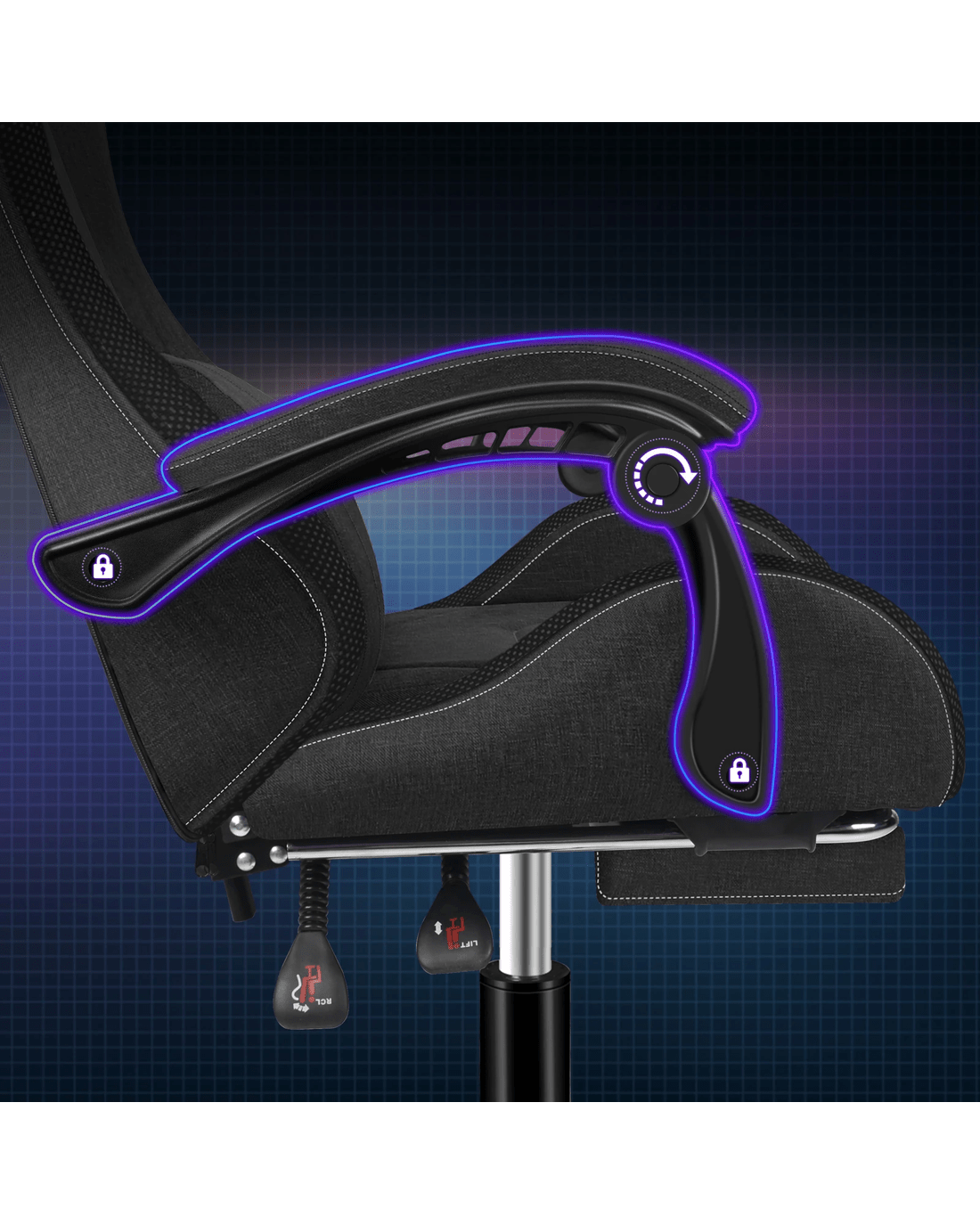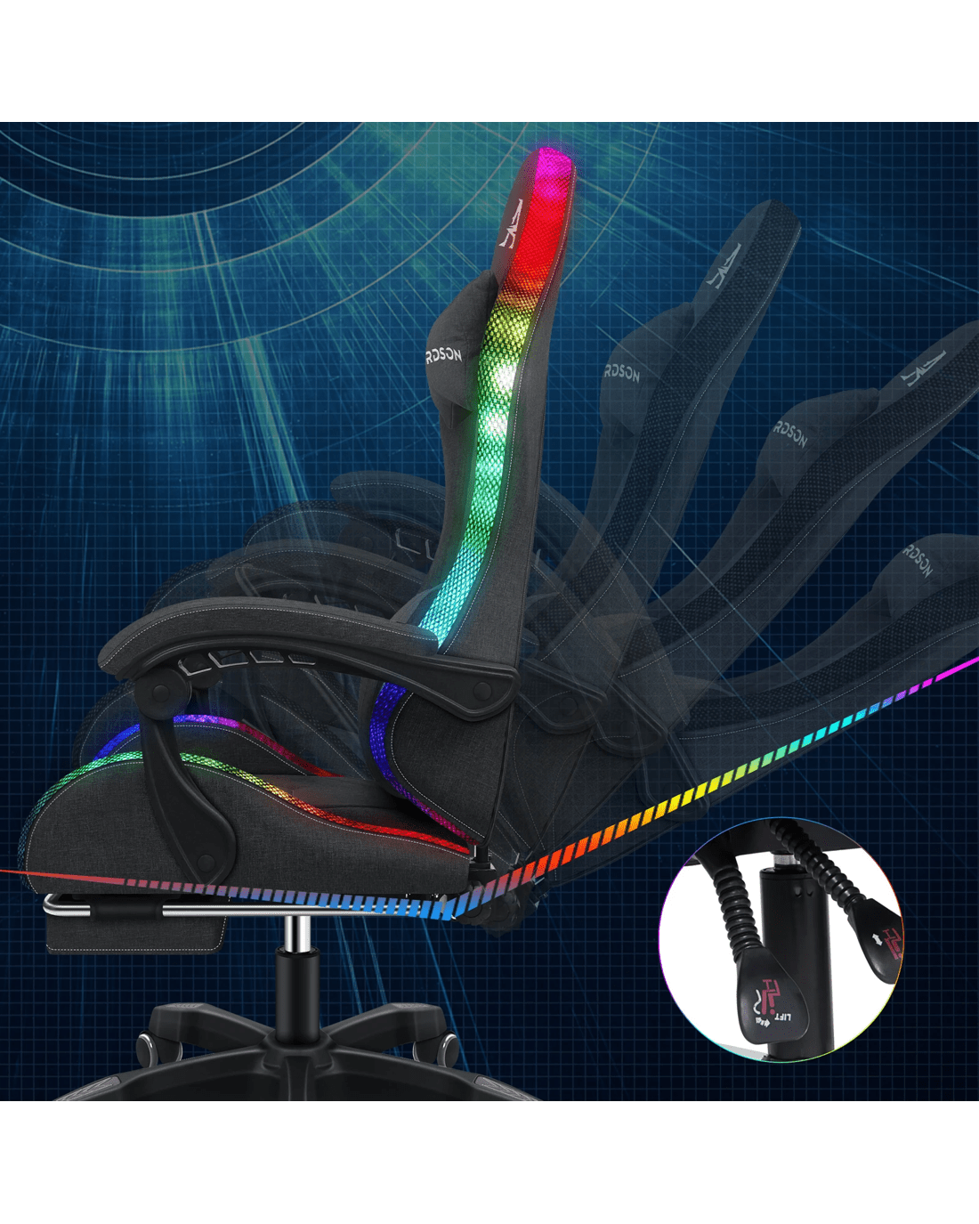 Advanced RGB LED lighting design - With 12 colours of LED and multiple light settings, this ergonomic gaming chair comes with hundreds of lighting modes, providing a unique and aesthetic glow to your gaming setup. Upholstery crafted from premium linen fabric and generous foam paddings ensures optimal durability and easy cleaning.