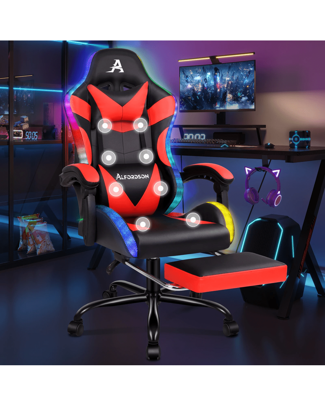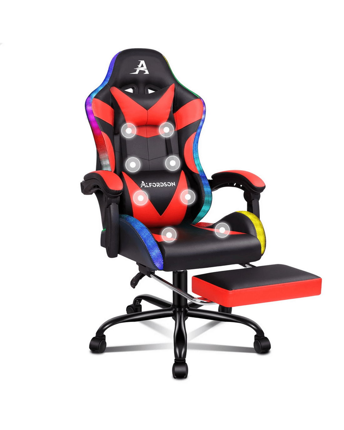 Alfordson Gaming Chair Office Massage 12 RGB LED Computer Seat PU Leather - Red