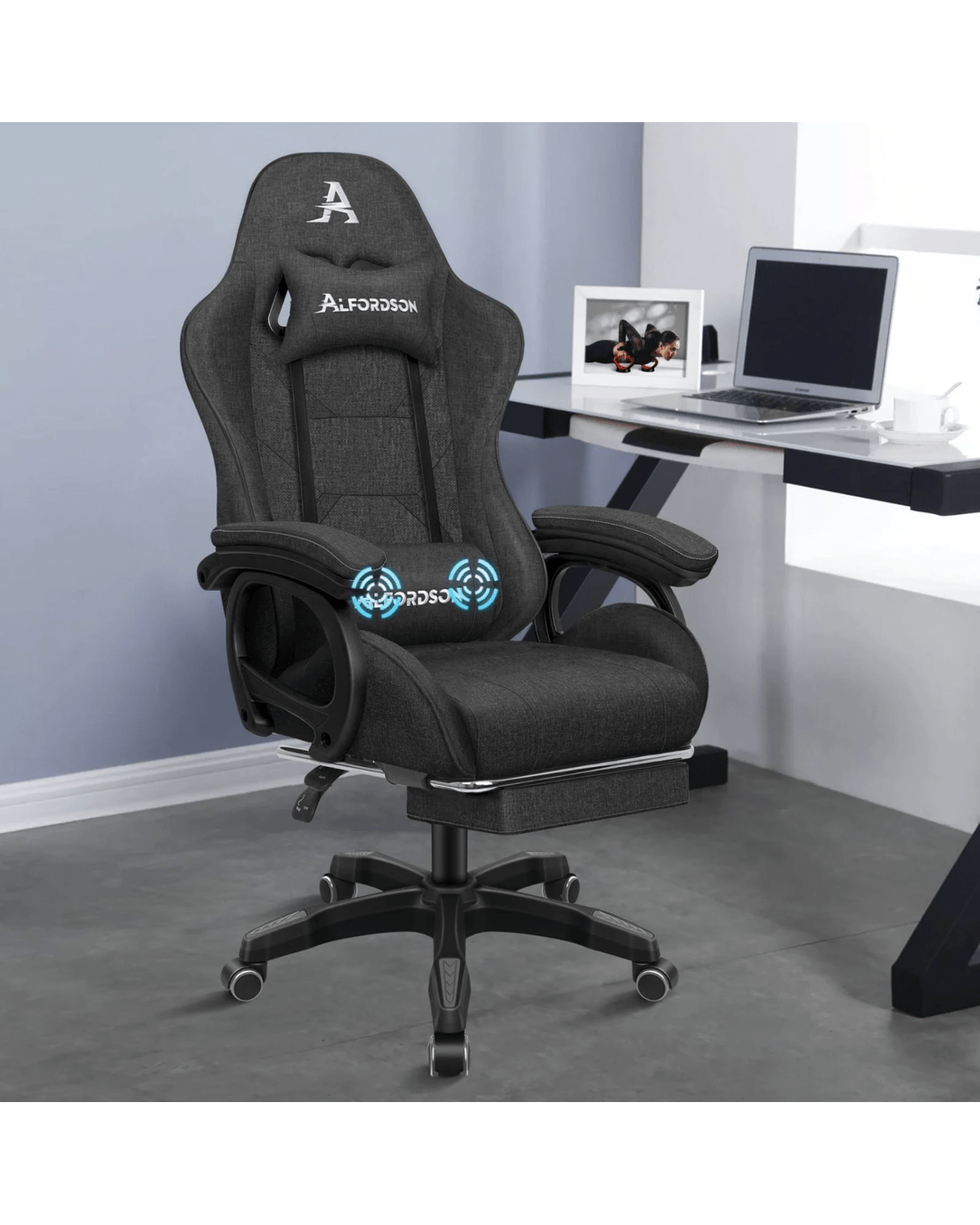 Crafted with deluxe linen fabric, generous foam paddings and ergonomically-friendly design with detachable and height-adjustable lumbar and neck cushions, our racer chair provides your entire body with ample support in all the right places. The 2-point lumbar massage function allows you to work or play at your peak for long periods of time in optimal comfort. With an X pattern in the middle, the Xavier chair perfectly combines both comfort and style.