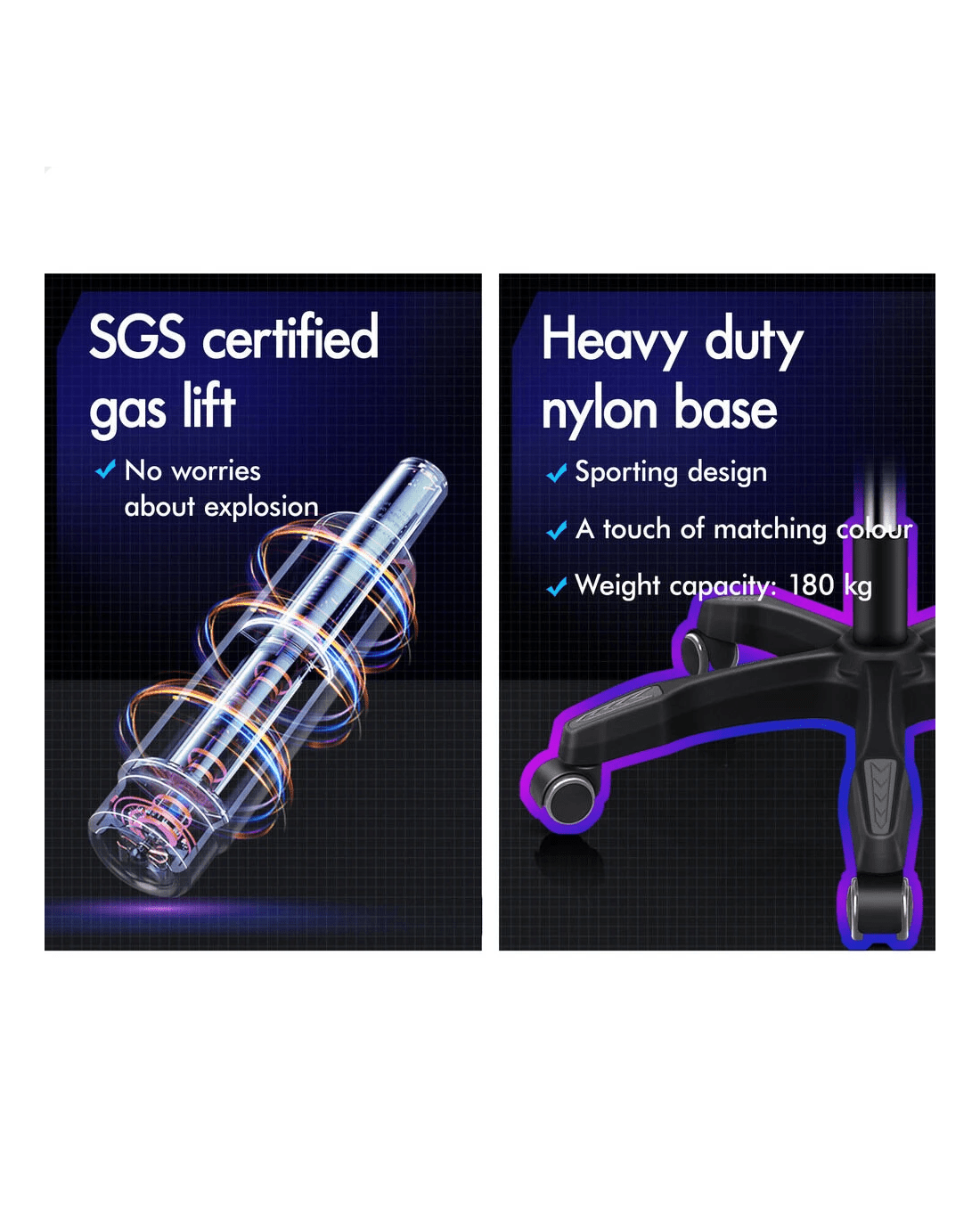 A stylish nylon base with Gas-Liftsystem and tilt function, delivering absolute five star luxury. And unlike some other sellers, we have no compromise on materials Use - guarantee that no cycled foams are Use - backrest is cut short or narrow to save money, and no seat foam is cut thin to save cost.