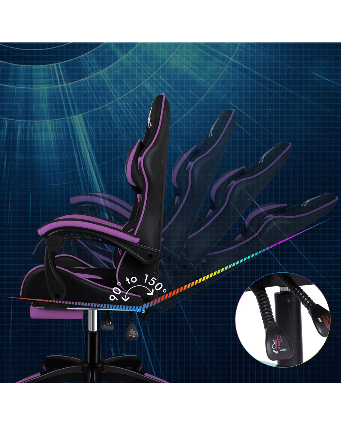 It features a sturdy nylon base with up to 150?? back recline adjustment and 360?? swivel, you can lock the position of reclination as you wish. Upholstery crafted from premium PU leather and generous foam paddings ensures optimal durability and easy cleaning. The heavy duty base merges robust support with color - accented style, syncing seamlessly with your gaming setup