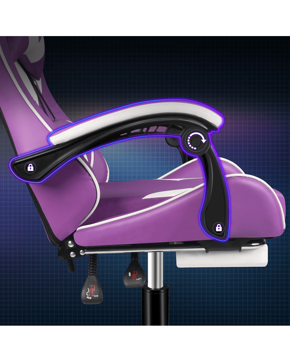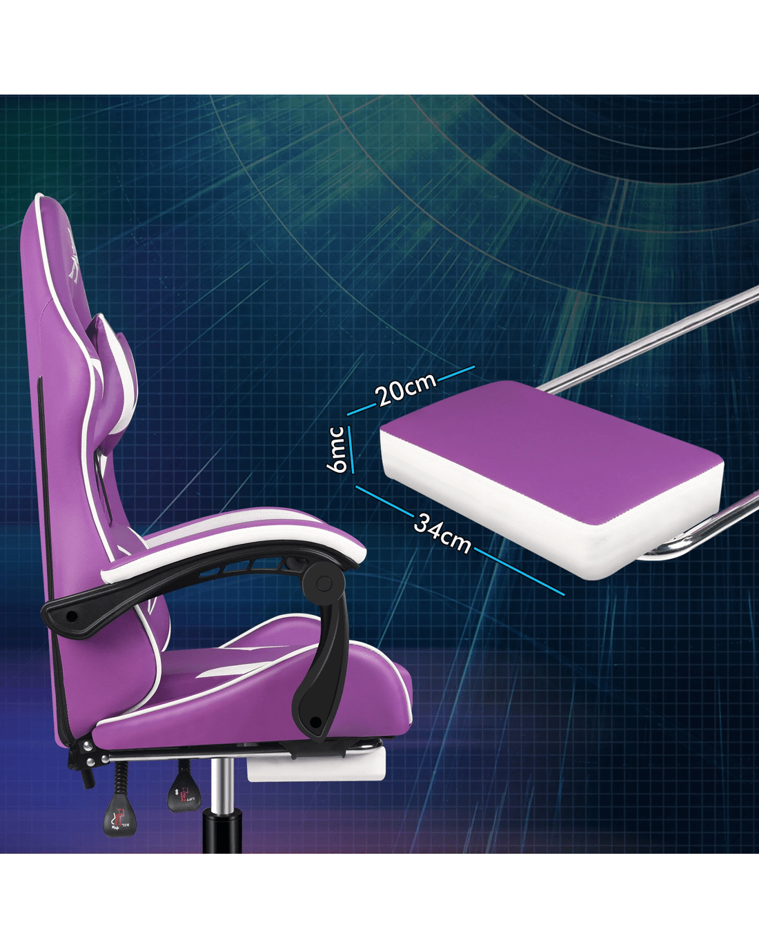 The ergonomic gaming chair is combined with retractable padded footrest that suits your personalized positions while sitting, sleeping, working or playing games. An elite in quality and design, your solution to true comfort.