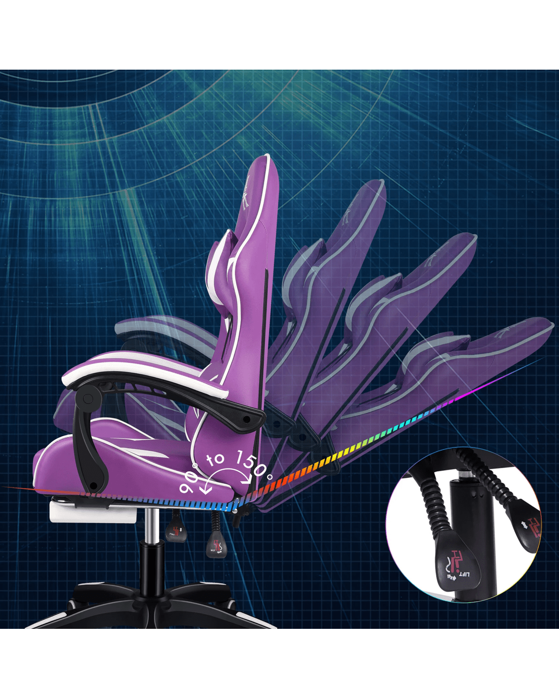 It features a sturdy nylon base with up to 150?? back recline adjustment and 360?? swivel, you can lock the position of reclination as you wish. Upholstery crafted from premium PU leather and generous foam paddings ensures optimal durability and easy cleaning. The heavy duty base merges robust support with color - accented style, syncing seamlessly with your gaming setup