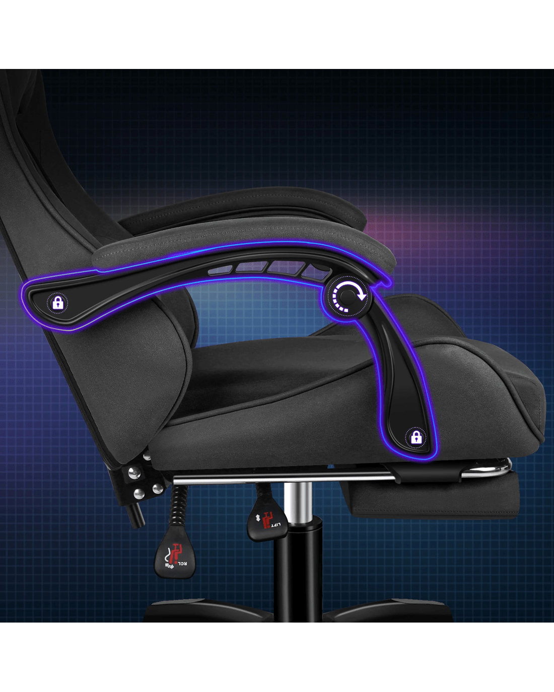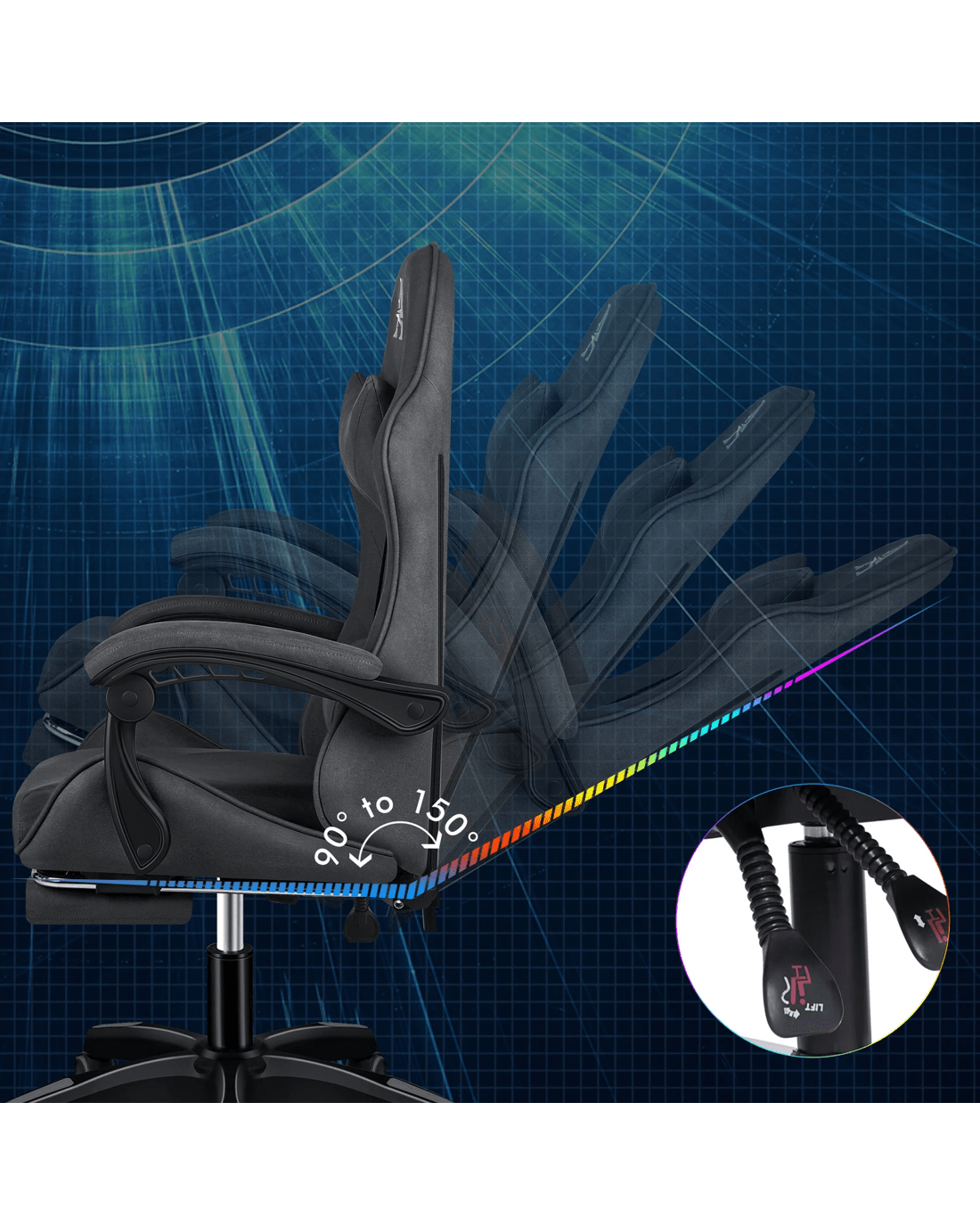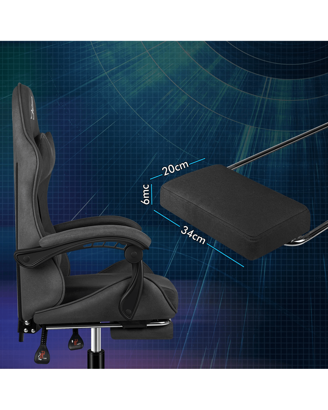 The ergonomic gaming chair is combined with retractable padded footrest that suits your personalized positions while sitting, sleeping, working or playing games. An elite in quality and design, your solution to true comfort.