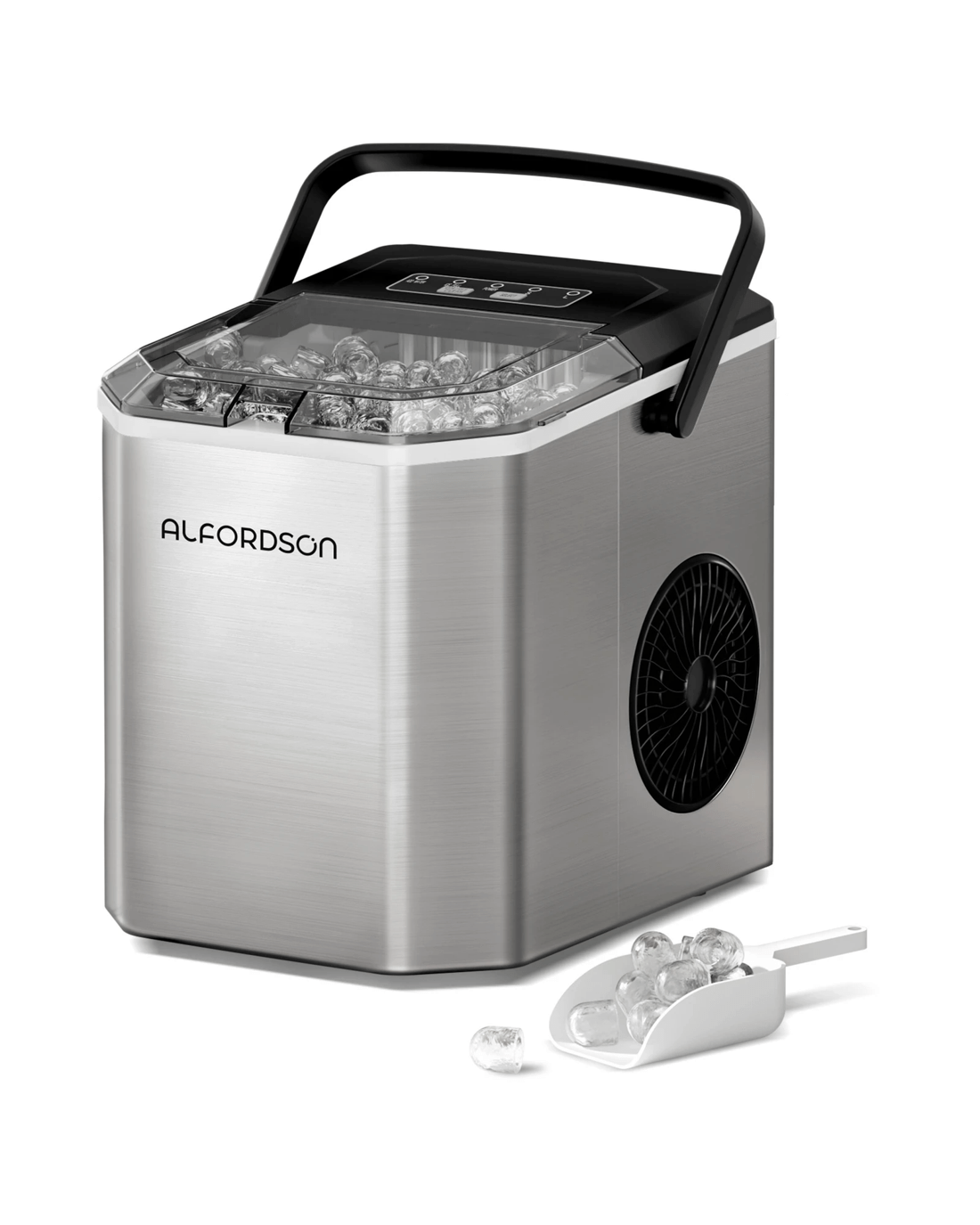 Designed with convenience in mind - This ice maker also includes a easy-grip handle for better portability - ideal for moving between the kitchen, patio, or on trips. Plus, the added scoop holder keeps your ice scoop neatly in place and hygienic, so it's always within reach when you need it.