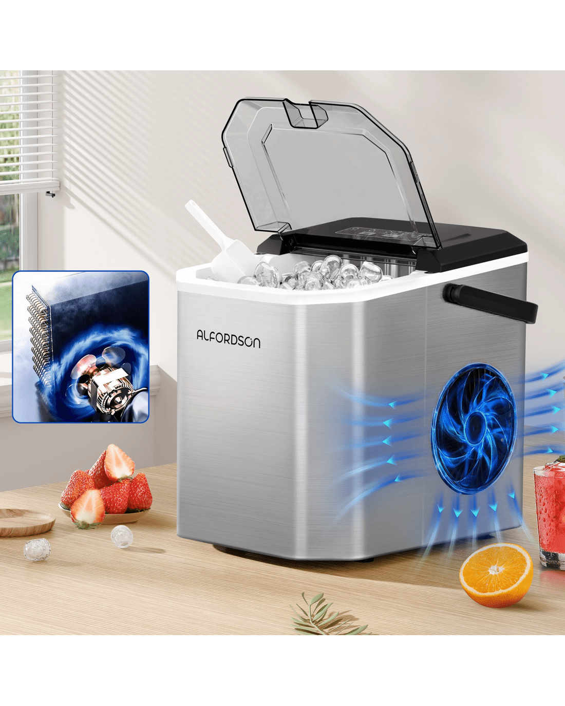 Engineered for excellence & durability - Built to last, this ice maker features unique condenser fan for quicker heat dissipation, resulting in faster ice production and an extended machine lifep. The triple-layer shell structure ensures energy-efficient operation and ice that stays frozen longer.