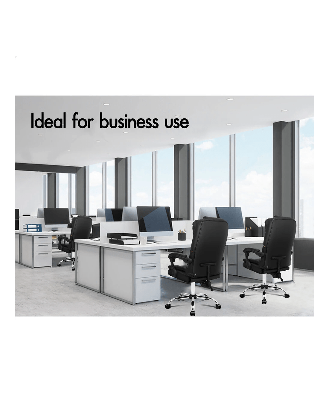 It features a sturdy chrome base with up to 150 degree back recline adjustment and 360 degree swivel, you can lock the position of reclination as you wish. Upholstery crafted from premium PU leather and generous foam paddings ensures optimal durability and easy cleaning.