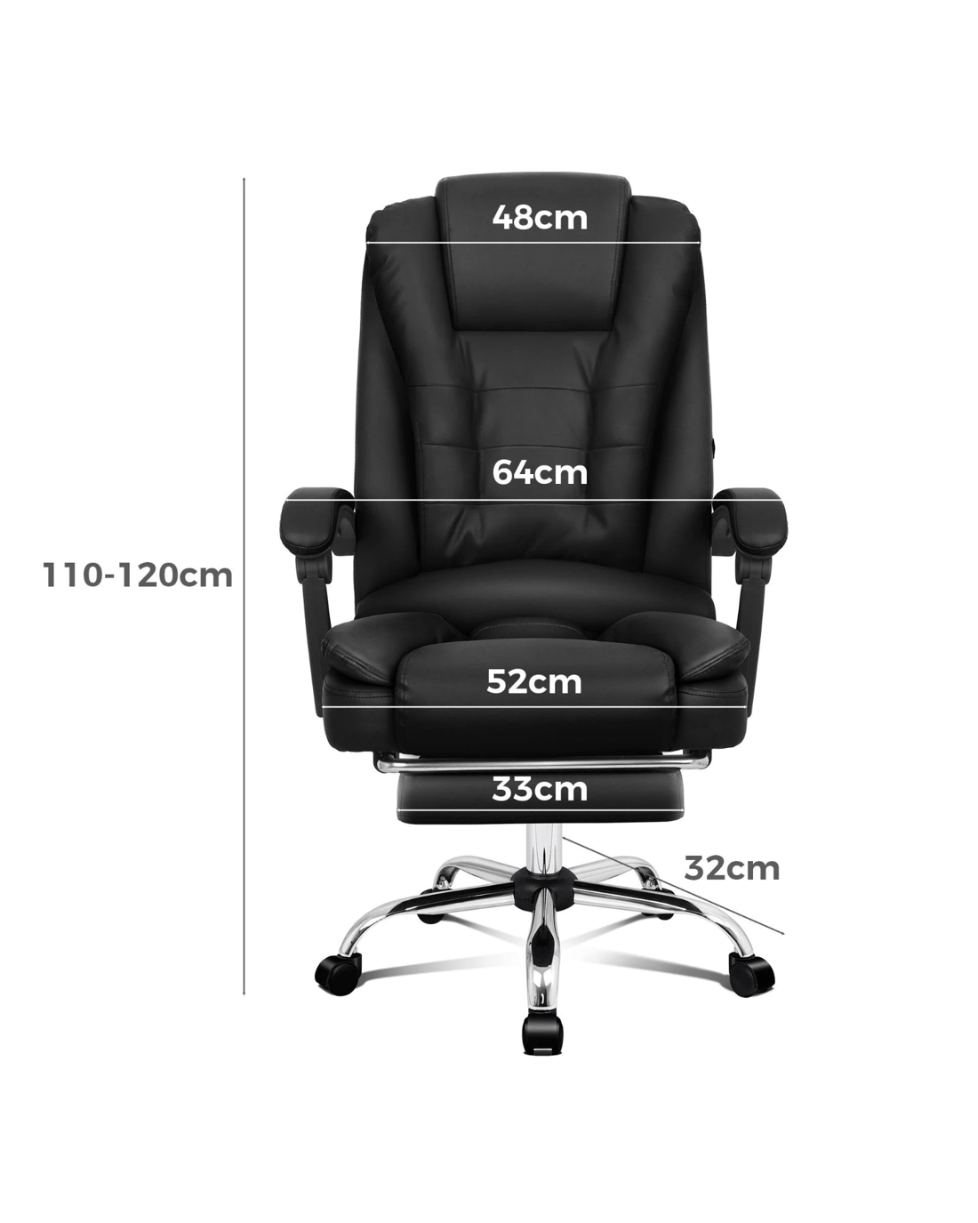 It features a sturdy chrome base with up to 150 degree back recline adjustment and 360 degree swivel, you can lock the position of reclination as you wish. Upholstery crafted from premium PU leather and generous foam paddings ensures optimal durability and easy cleaning.