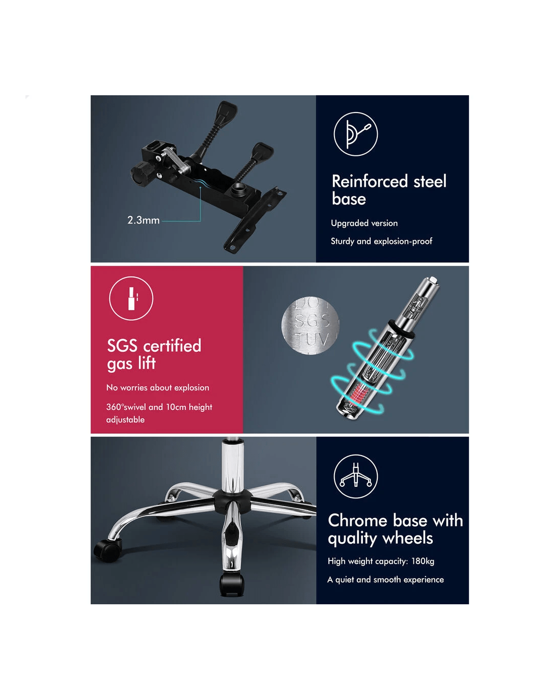 It features a sturdy chrome base with up to 150 degree back recline adjustment and 360 degree swivel, you can lock the position of reclination as you wish. Upholstery crafted from premium PU leather and generous foam paddings ensures optimal durability and easy cleaning.
