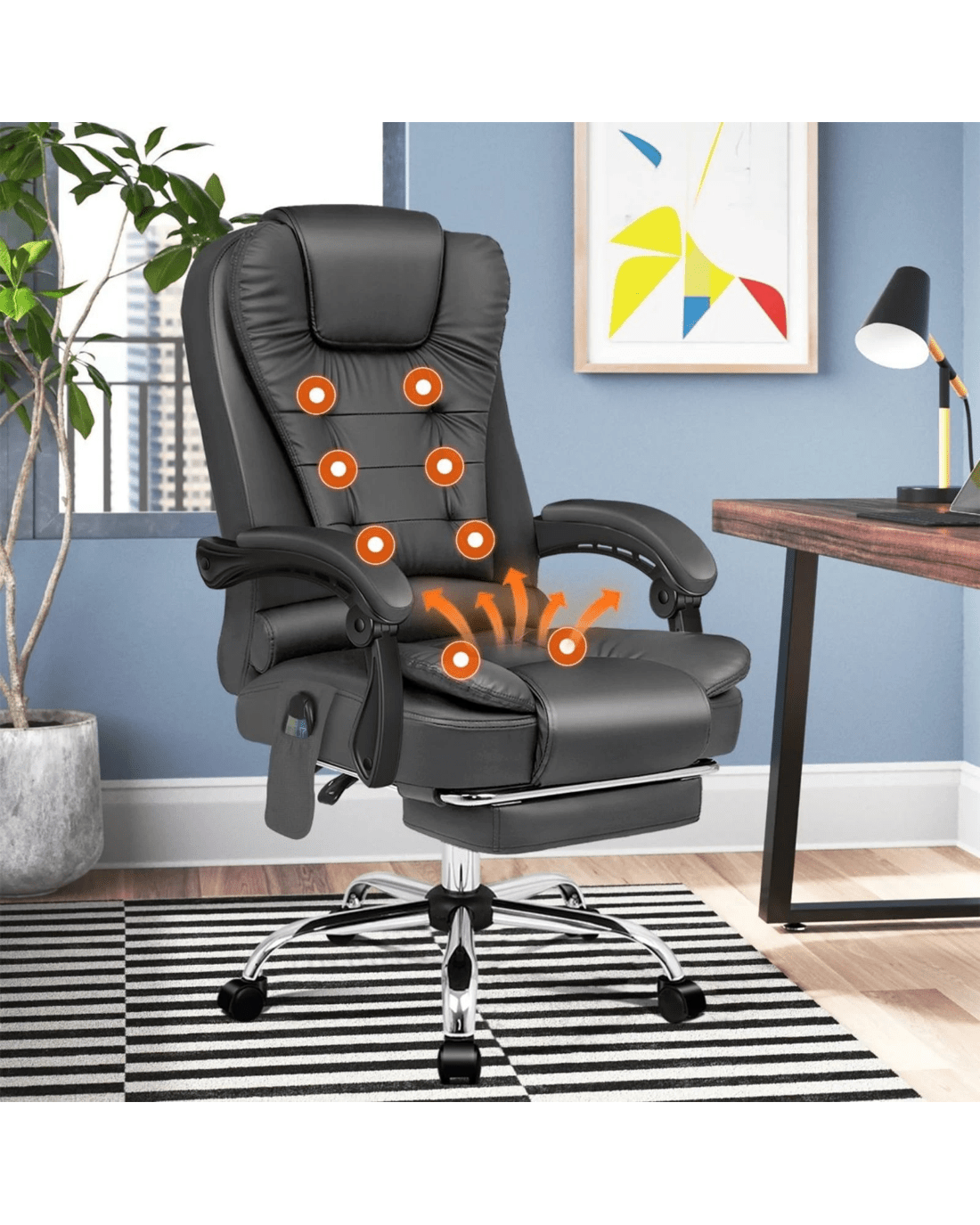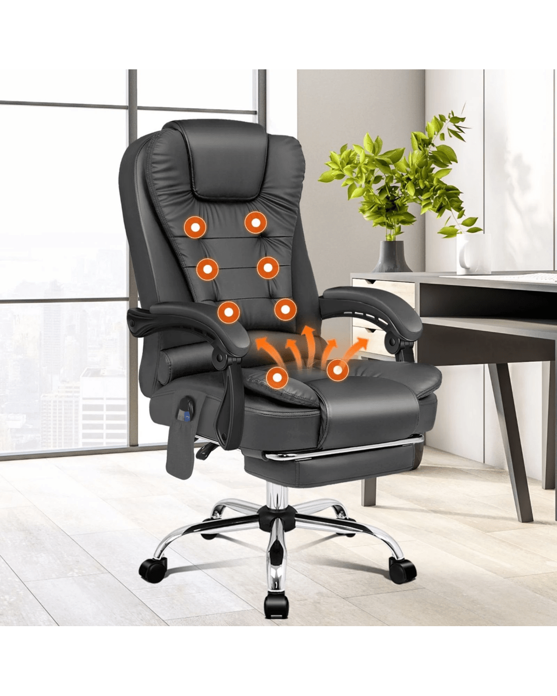 Crafted with innovation in mind, we upgraded the chair with 8 massage points and gentle seat heat function, allows you to work at your peak for long periods of time in optimal comfort. Built with premium PU leather, generous foam paddings and ergonomically-friendly design, our chair provides your entire body with ample support in all the right places. The chair perfectly combines both comfort and style.