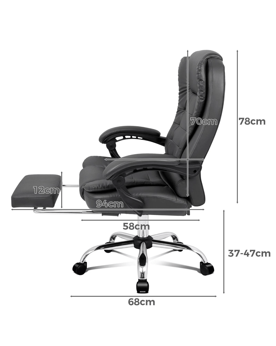 A stylish chrome base with Gas-Lift system and tilt function, delivering absolute five star luxury. And unlike some other sellers, we have no compromise on materials Use - guarantee that no cycled foams are Use - backrest is cut short or narrow to save money, and no seat foam is cut thin to save cost.