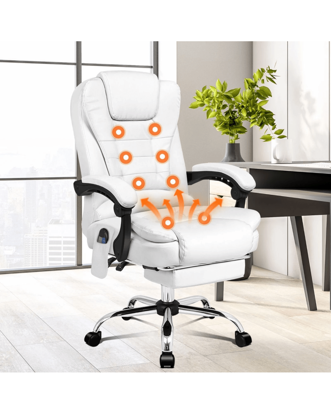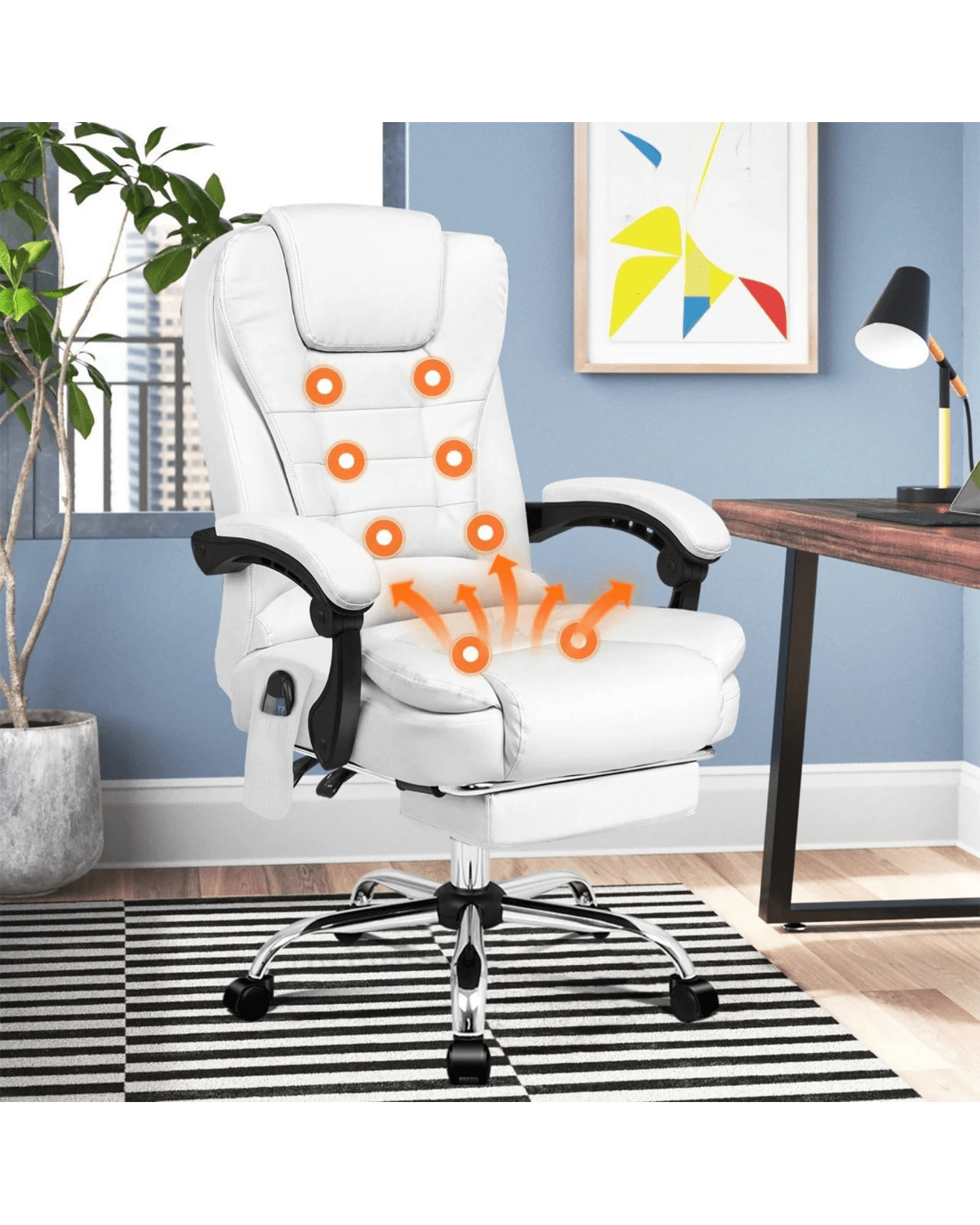Crafted with innovation in mind, we upgraded the chair with 8 massage points and gentle seat heat function, allows you to work at your peak for long periods of time in optimal comfort. Built with premium PU leather, generous foam paddings and ergonomically-friendly design, our chair provides your entire body with ample support in all the right places. The chair perfectly combines both comfort and style.