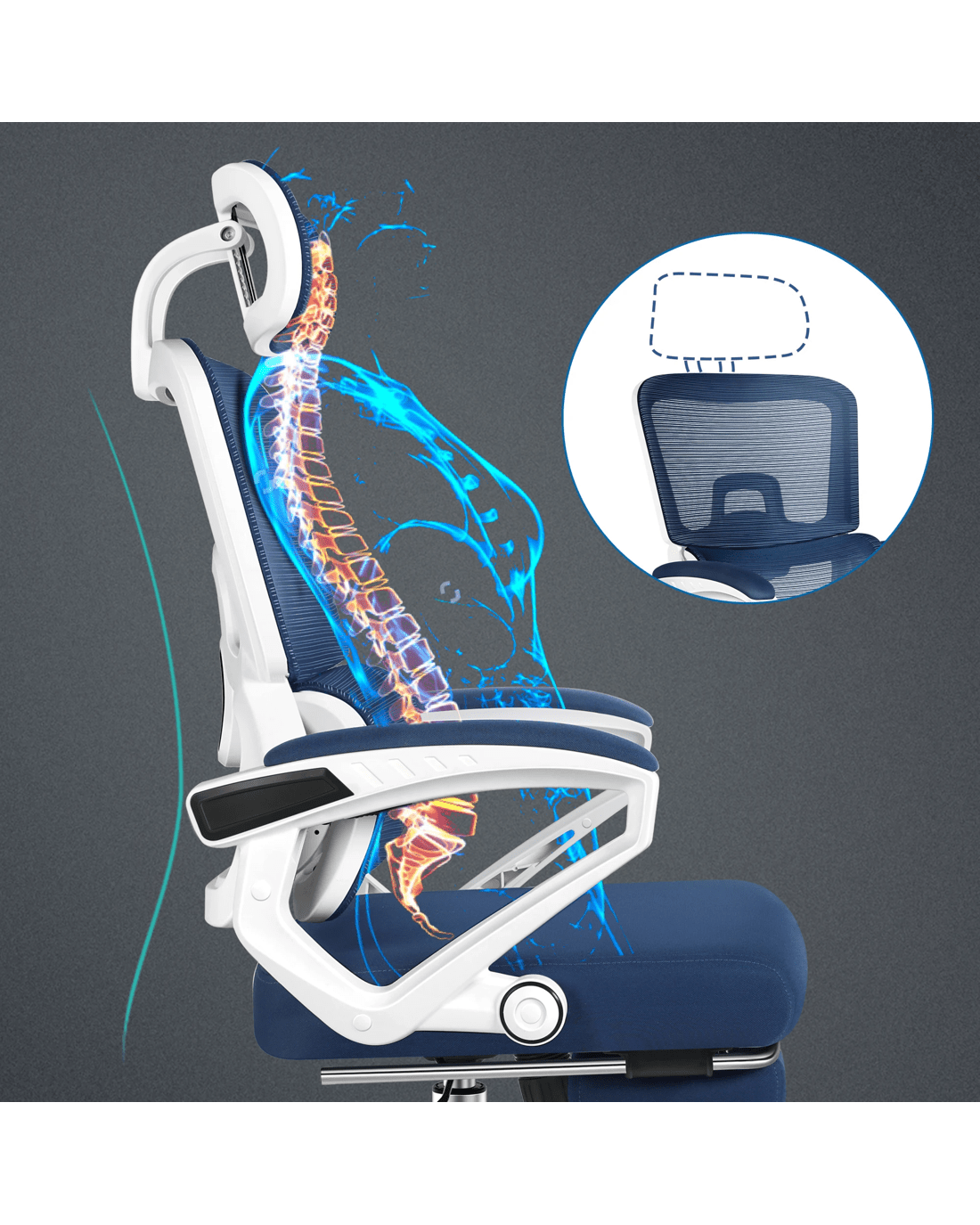 Featuring 2 strong lumbar coil springs for enhanced waist support, this mesh office chair eliminates lumbar fatigue - no more aching backs after long hours of sitting. Paired with a fully adjustable wider headrest, it cradles your neck perfectly and helps solve the common pain of neck strain.