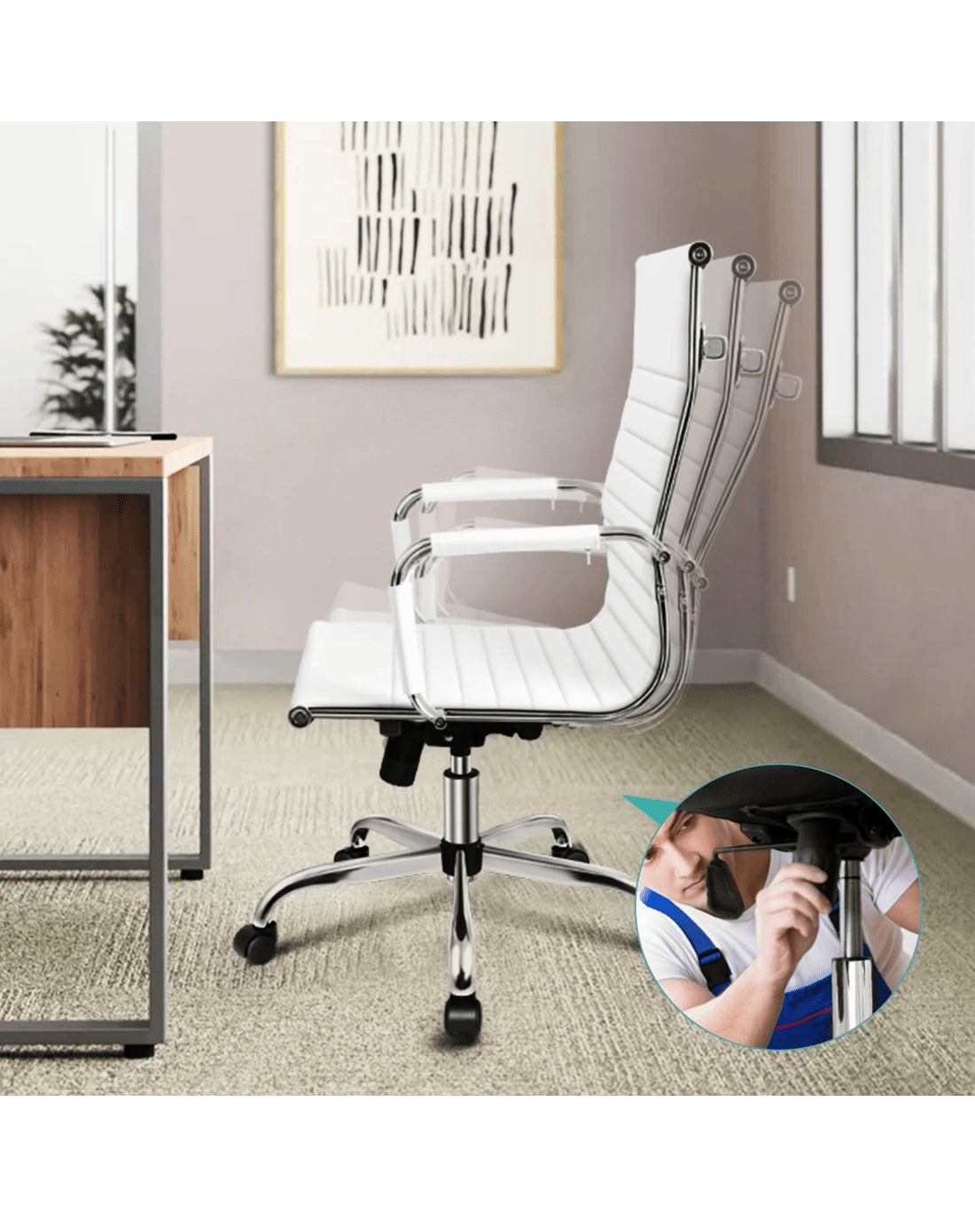 Constituted with a sturdy chrome base, the chair is endurable. You don't have to worry about tipping over or exploding. Better still, the shiny chrome base and footrest complement the modern design. The 360 degree swivel and height adjustable seat adds more convenience. 360 degree casters provide mobility, meanwhile keep the floor away from being scratched.