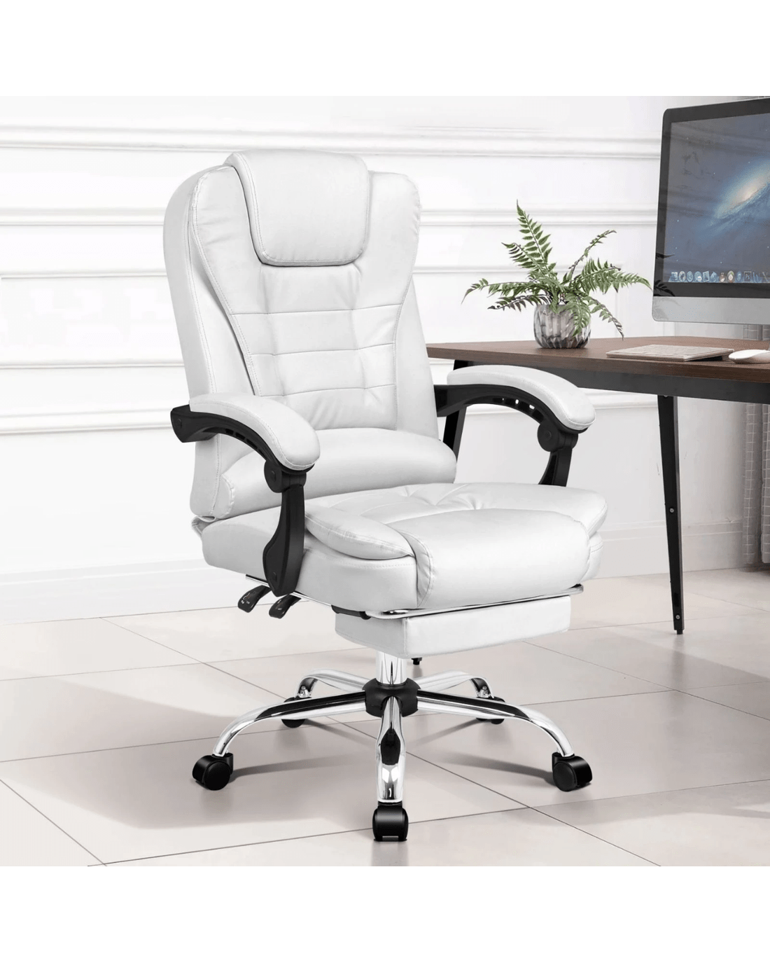 It features a sturdy chrome base with scuff protectors and 360 degree swivel. The double-stitched upholstery crafted from premium PU leather ensures optimal durability and easy cleaning.