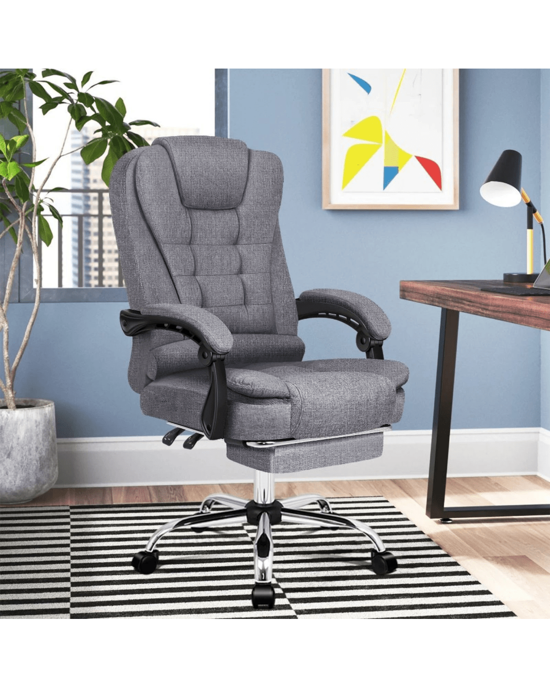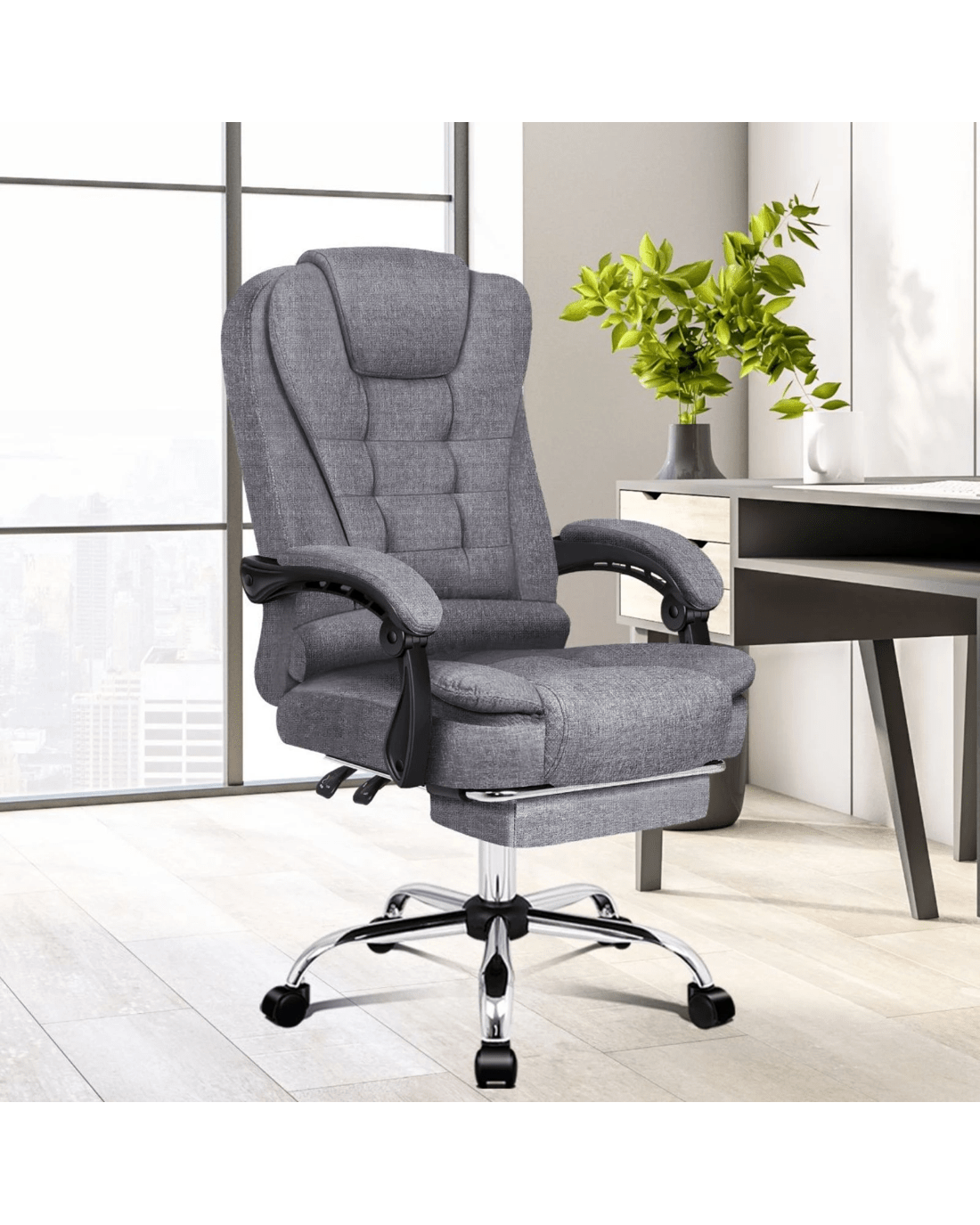 It features a sturdy chrome base with scuff protectors and 360 degree swivel. The double-stitched upholstery crafted from premium linen fabric ensures optimal durability and easy cleaning.