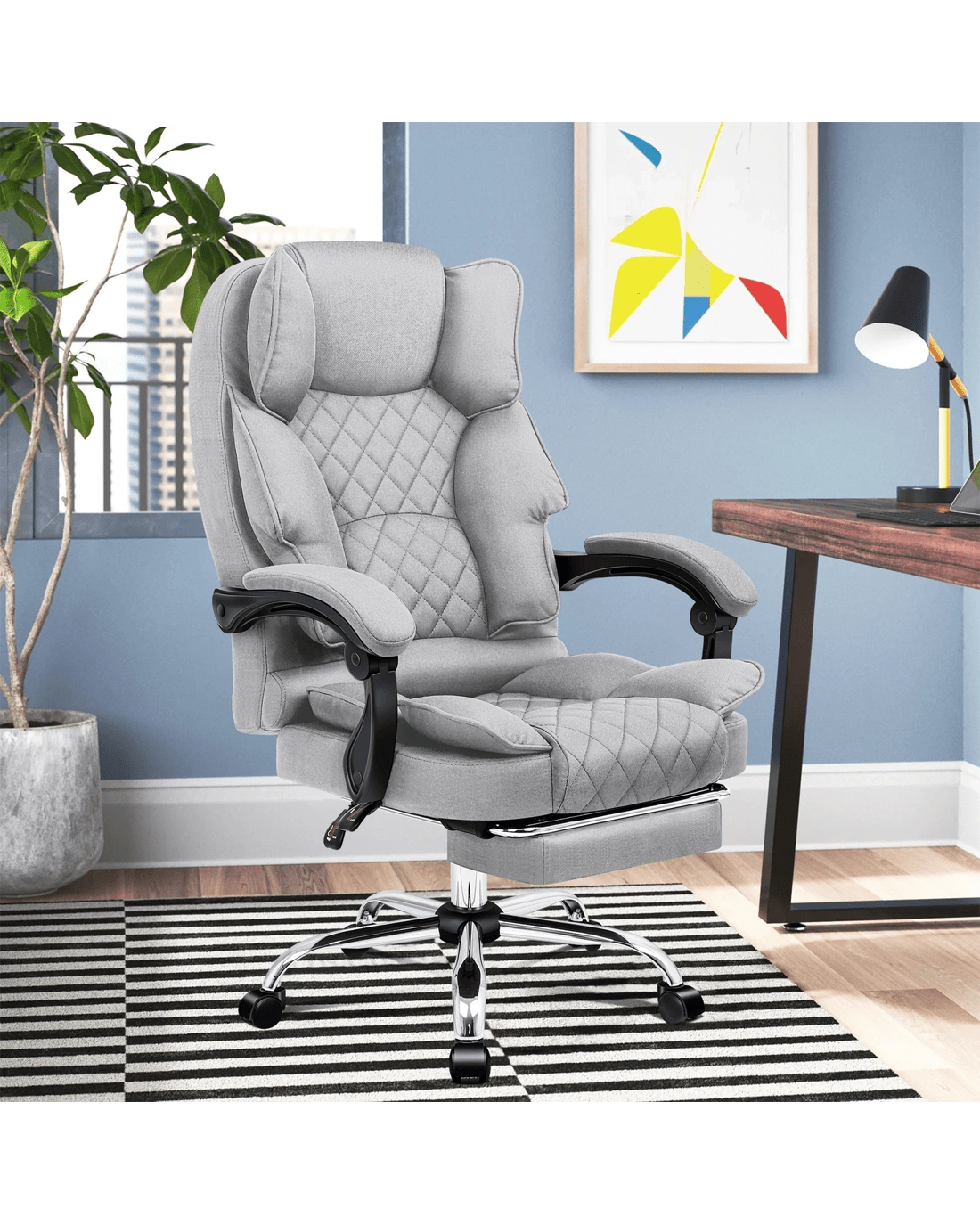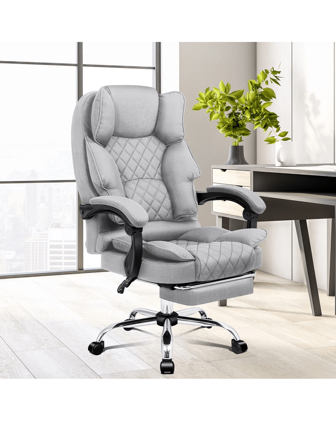 It features a sturdy chrome base with scuff protectors and 360 degree swivel. The double-stitched upholstery crafted from premium linen fabric ensures optimal durability and breathability.