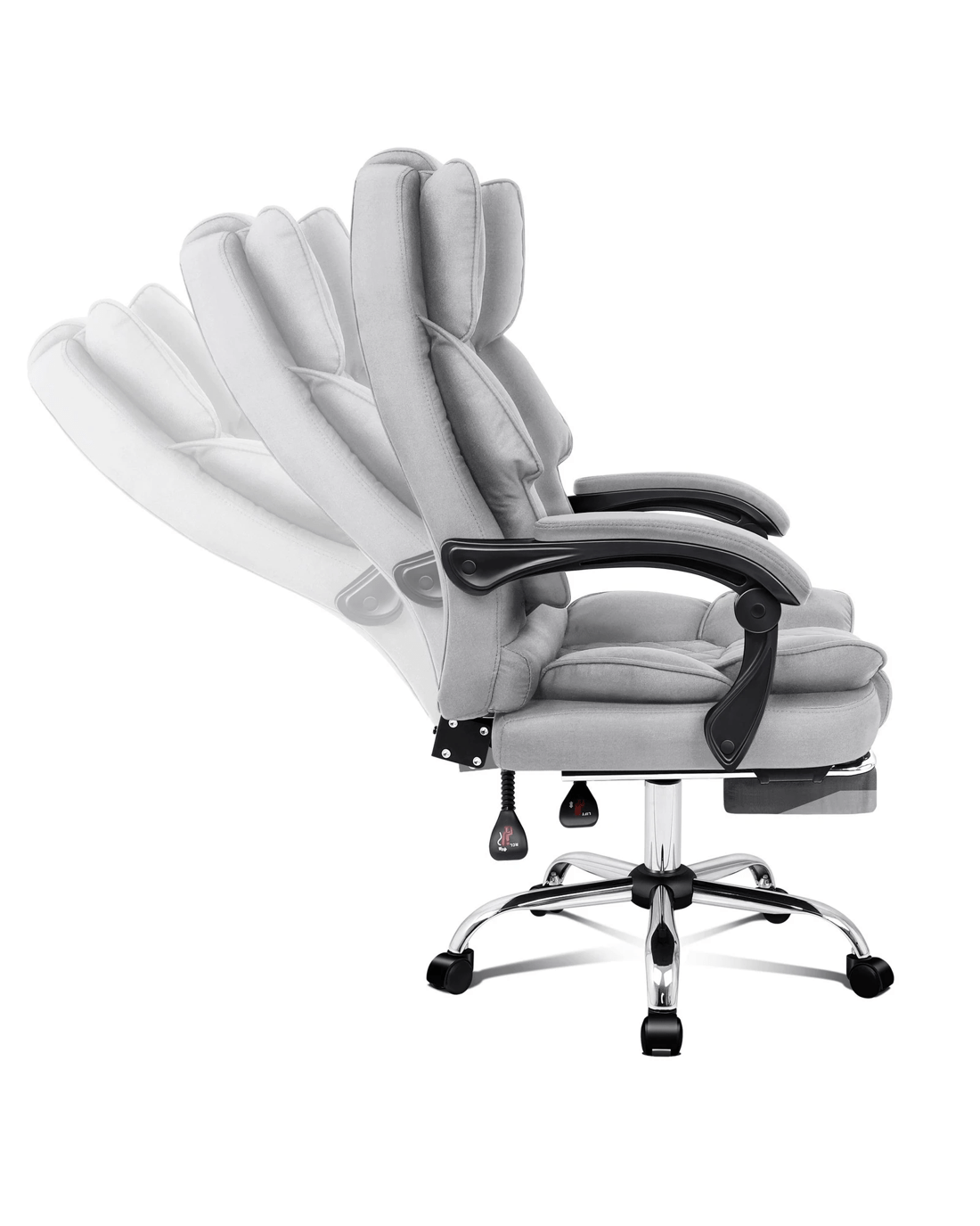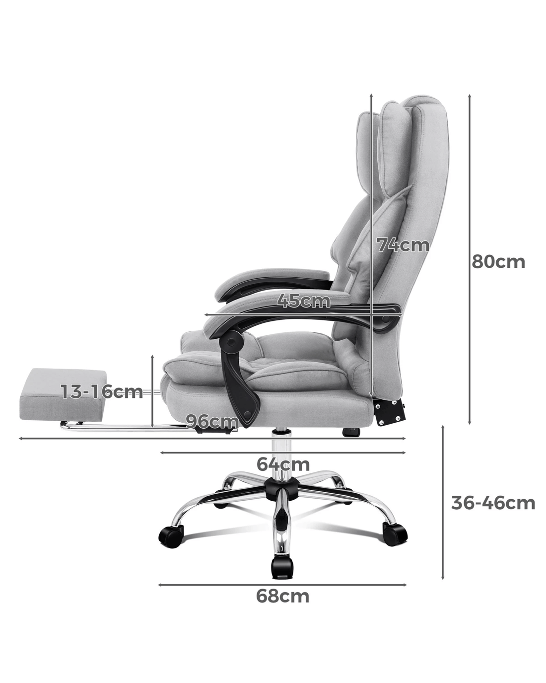A stylish chrome base withGas-Liftsystem and tilt function, delivering absolute five star luxury. Combined with retractable padded footrest and comfortable padded armrests, it gives the style and comfort you need. An elite in quality and design, your solution to true comfort.