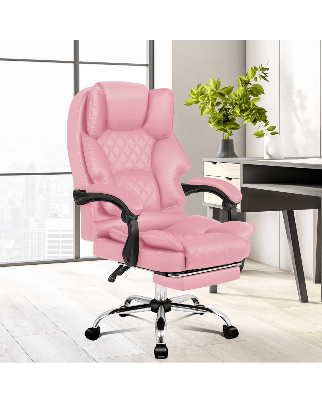 It features a sturdy chrome base with scuff protectors and 360 degree swivel. The double-stitched upholstery crafted from premium PU leather ensures optimal durability and easy cleaning.