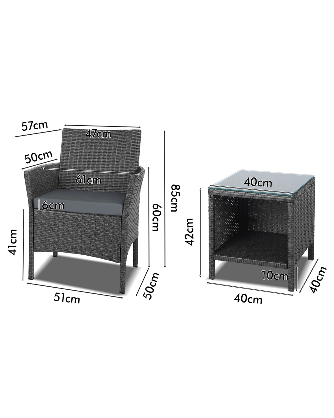 * Side table dimensions: 40 cm x 40 cm x 42 cm