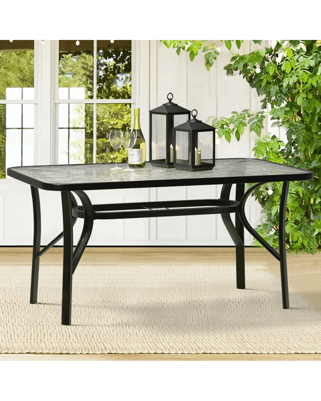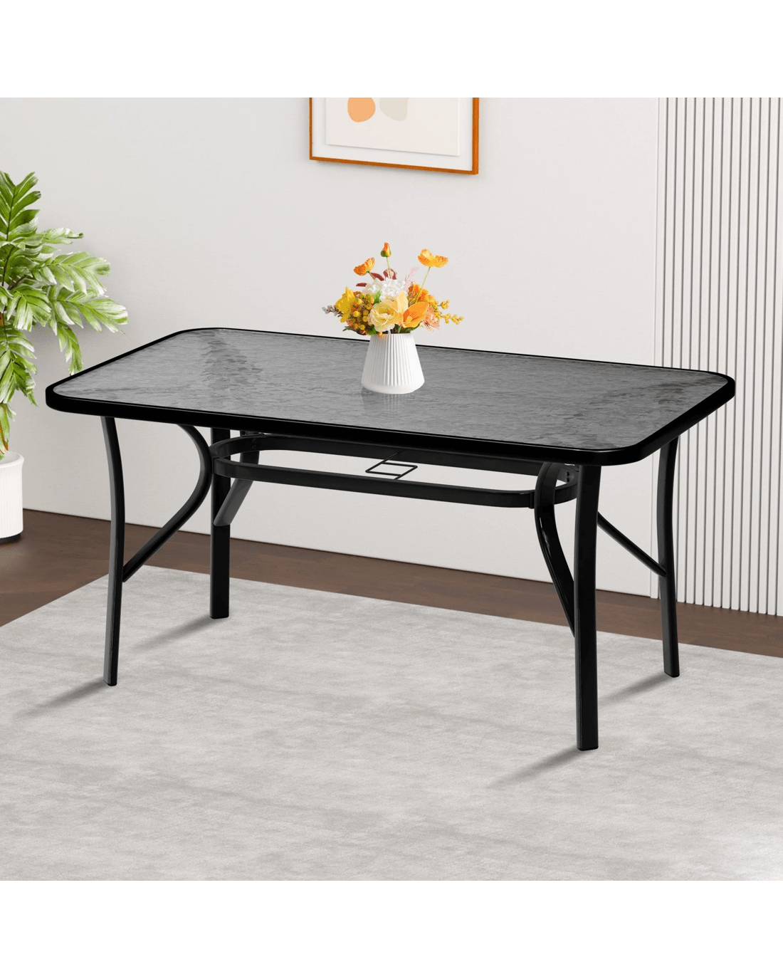Spacious dining table - Our dining table features unique outlook. With a built-in parasol hole with cover, it's convenient to install a parasol for a shade when the sun is shining brightly during outdoor time. And cover it up for a flat and smooth table when not necessary. Features with tempered glass table top, it is durable and safe.
